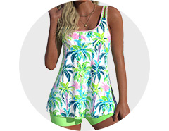 Tummy Coverage Mid Waisted Tropical Plants Print Tankini Set