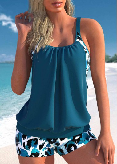 Added Successfully Printed Wide Strap Blue Tankini Top