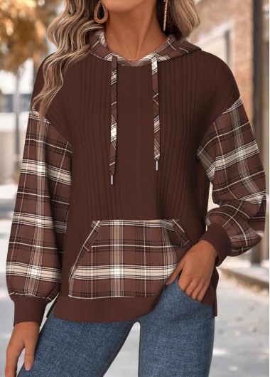 Dark Coffee Tummy Coverage Plaid Long Sleeve Hoodie