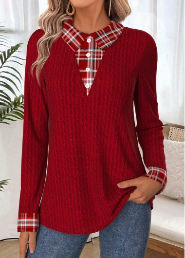 Wine Red Tummy Coverage Plaid Long Sleeve Blouse