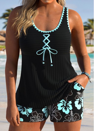 Lace Up Mid Waisted Tropical Plants Print Tankini Set