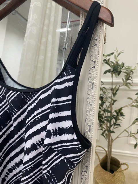 Tummy Coverage Tropical Plants Print Black Tankini Top