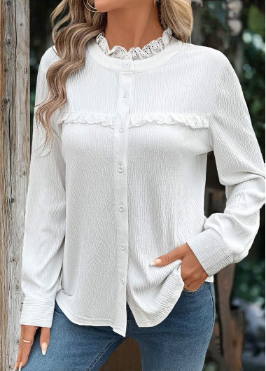 White Patchwork Shirt Collar Button Up Thin Blouse