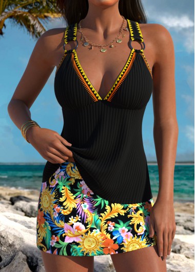 Added Successfully Tummy Coverage Mid Waisted Floral Print Black Tankini Set