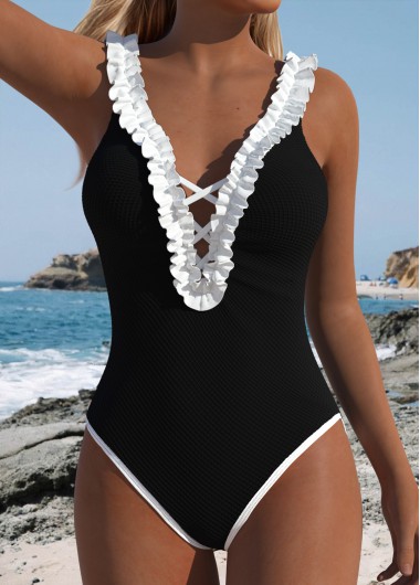 Added Successfully Contrast Binding Patchwork Black Tankini Set