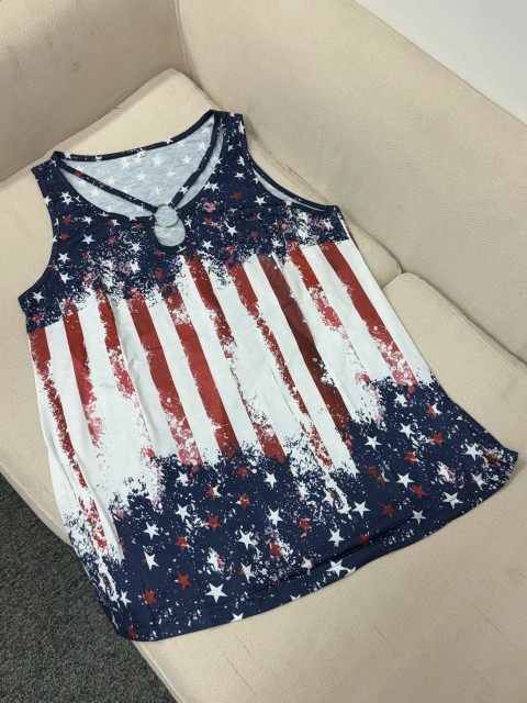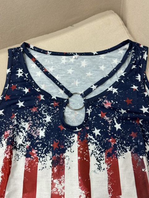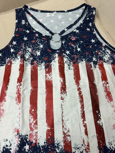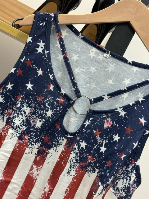 Show your patriotic flair with our trendy mid-length flag-inspired camisole! This stylish piece features a circular ring and cut-out design at the chest, adding a unique touch. Perfect with denim shorts, this tank top offers comfort and ease, making it ideal for everyday wear. Celebrate in style and stay cool with this lightweight, fashionable addition to your summer wardrobe!