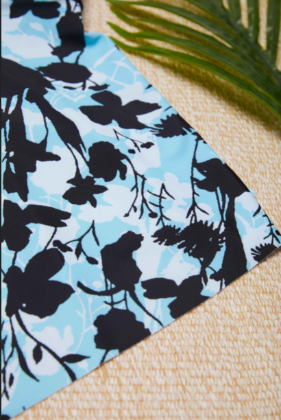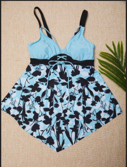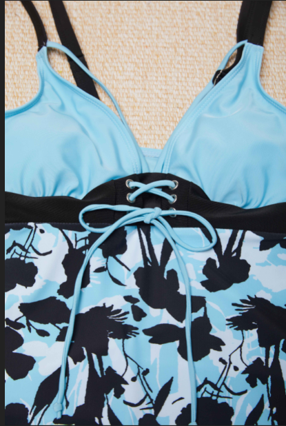 Mid Waisted Leaf Print Royal Blue Tankini Set