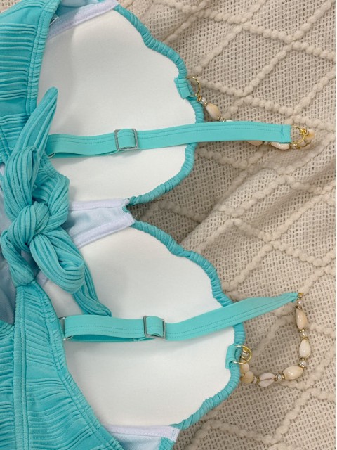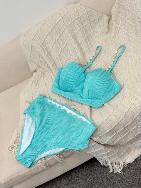 V-Neck Lace Cyan One Piece Swimwear and Bra