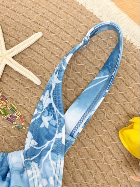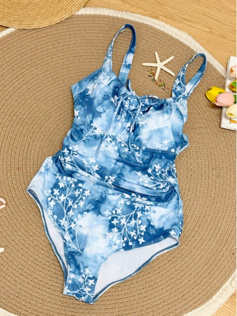 Drawstring Tropical Plants Print Cyan One Piece Swimwear