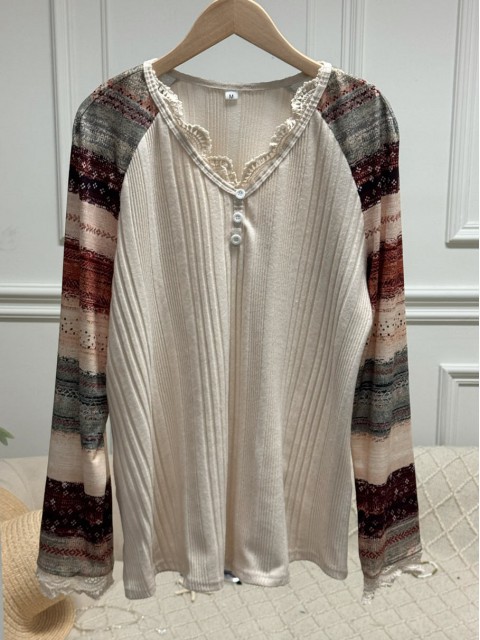 White Patchwork Long Sleeve Round Neck T Shirt
