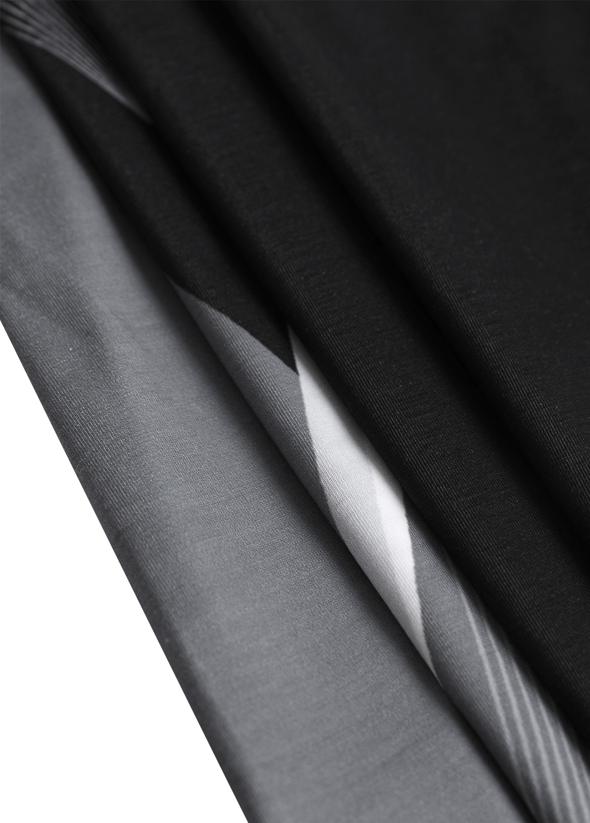 Get ready to spice up your wardrobe with our V-neck short-sleeve tee! This black and grey geometric striped shirt features a unique crisscross design at the chest and an eye-catching ombre effect. Plus, it offers tummy coverage for those days when you want extra comfort. Perfect for everyday casual wear, this tee is anything but ordinary!