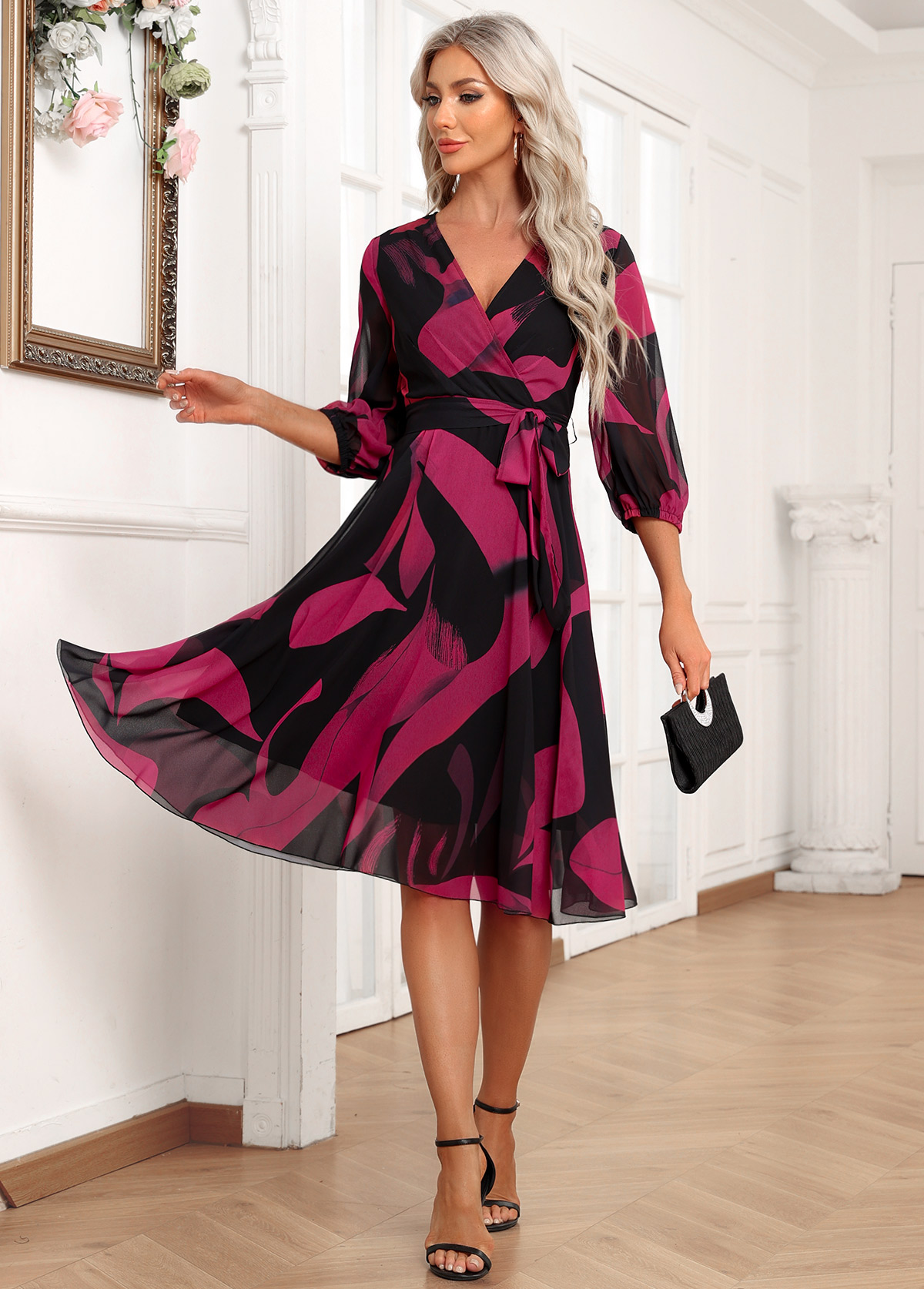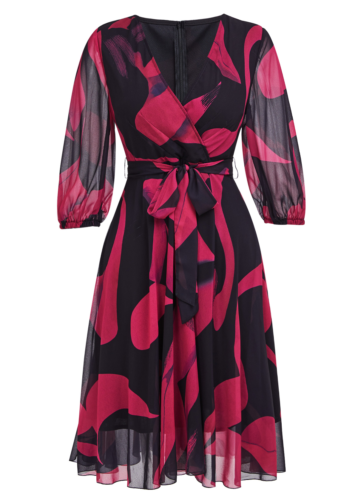 Pink Patchwork Striped A Line 3/4 Sleeve Dress