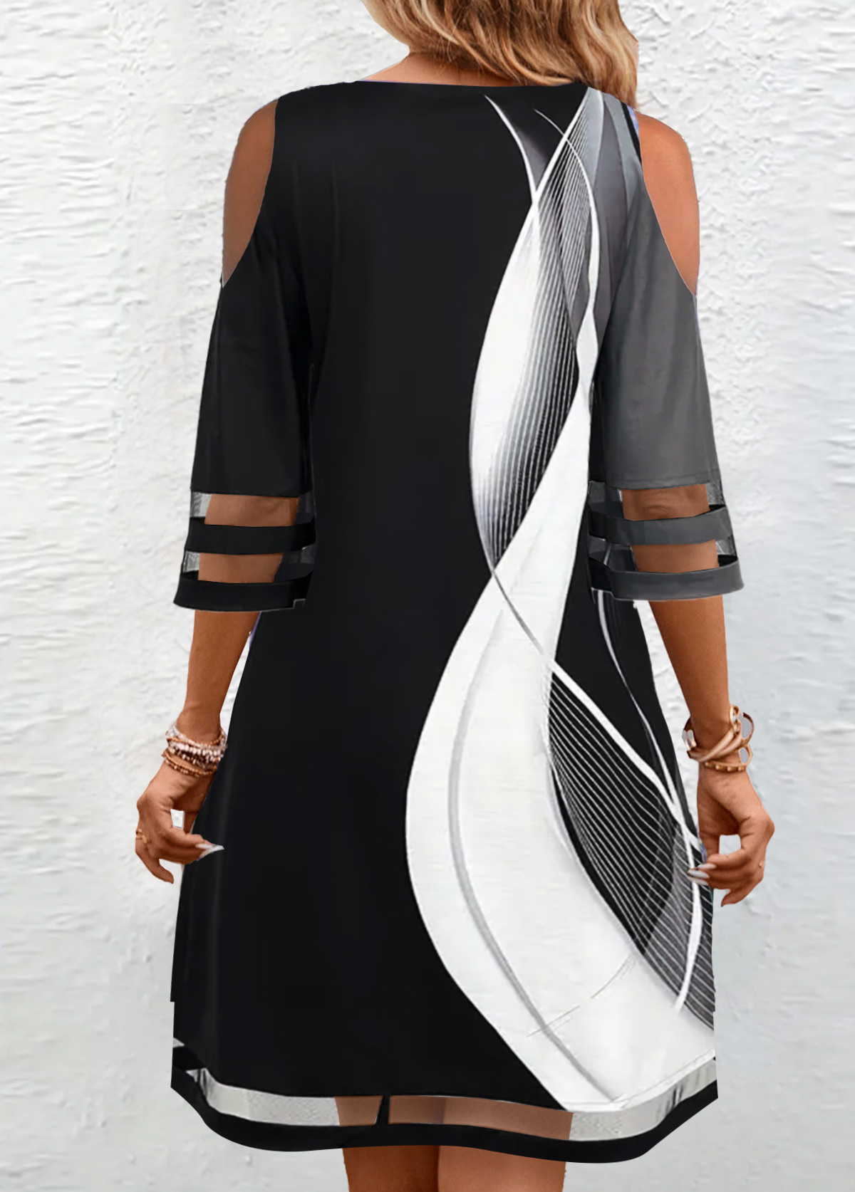 women's clothes / Dresses  /  Black Mesh Geometric Print A Line 3/4 Sleeve Dress