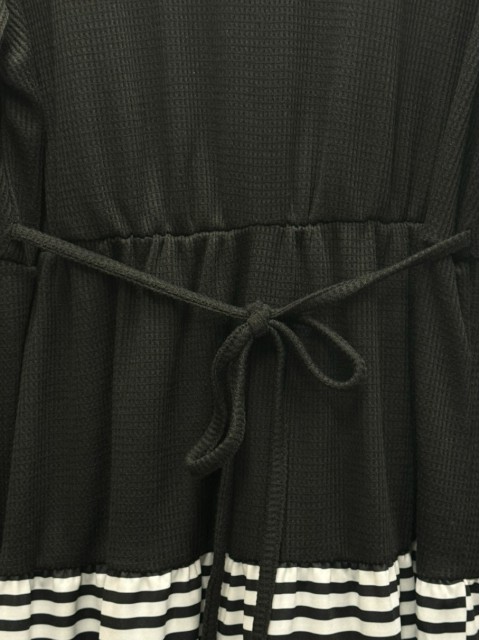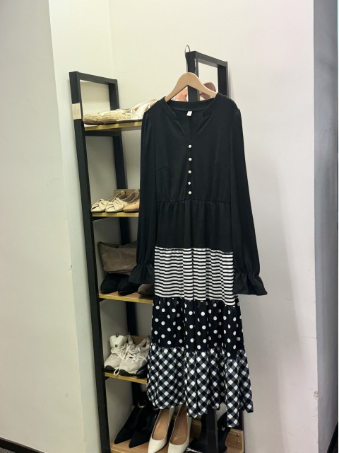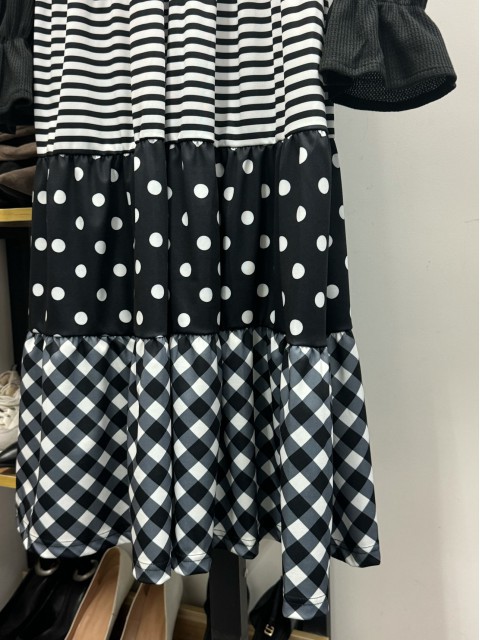 Step into effortless elegance with this stunning black dress. Featuring a chic split neckline, it seamlessly combines black and white stripes, geometric patterns, and playful white polka dots. The button detail at the chest adds a touch of allure, while the elastic waistband ensures comfort. With puff sleeves and soft, tummy-flattering fabric, it's perfect for casual outings.