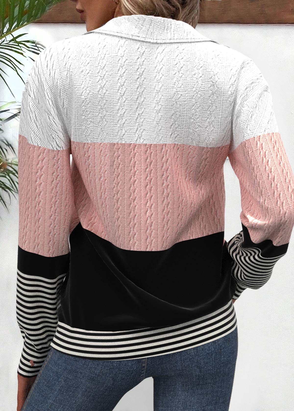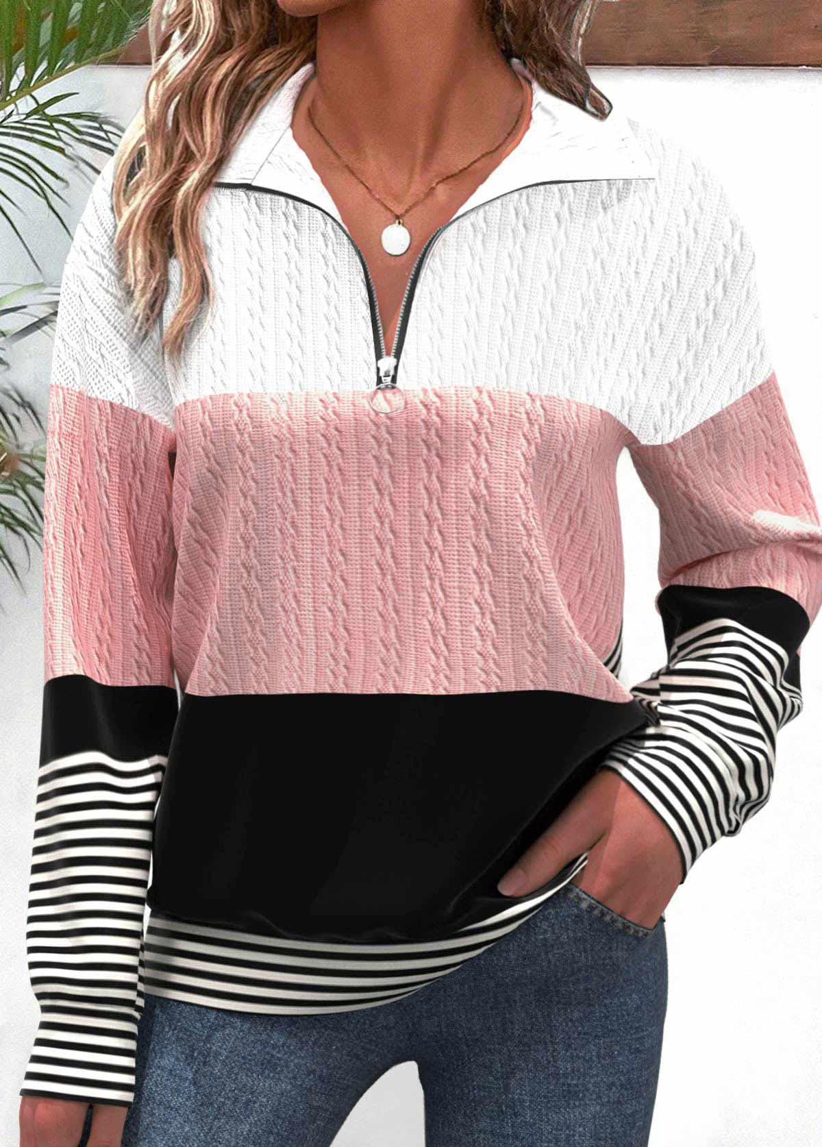 Black Zipper Striped Long Sleeve Turn Down Collar Sweatshirt
