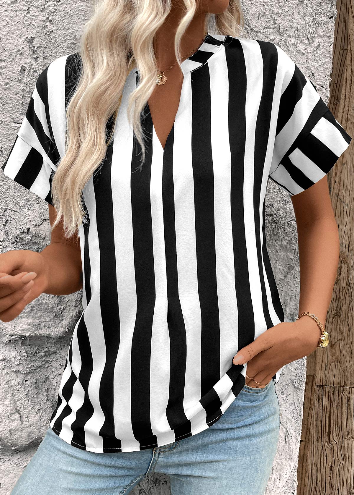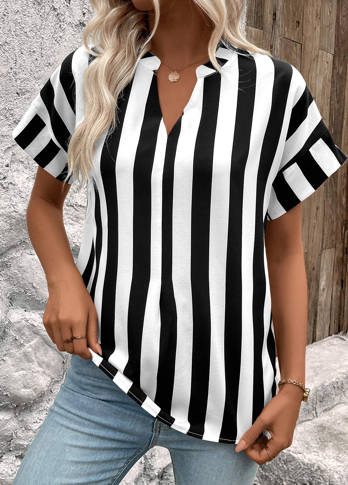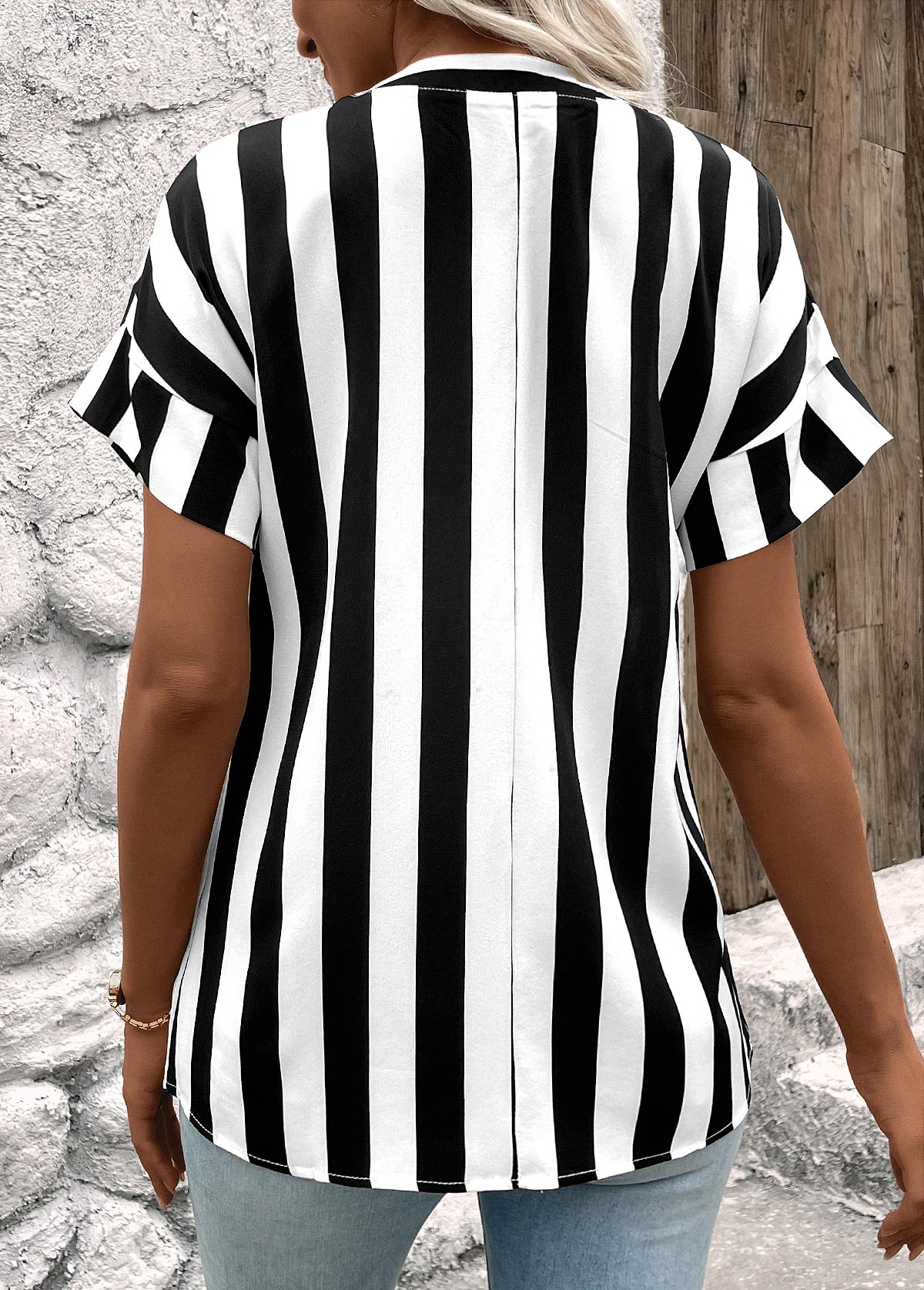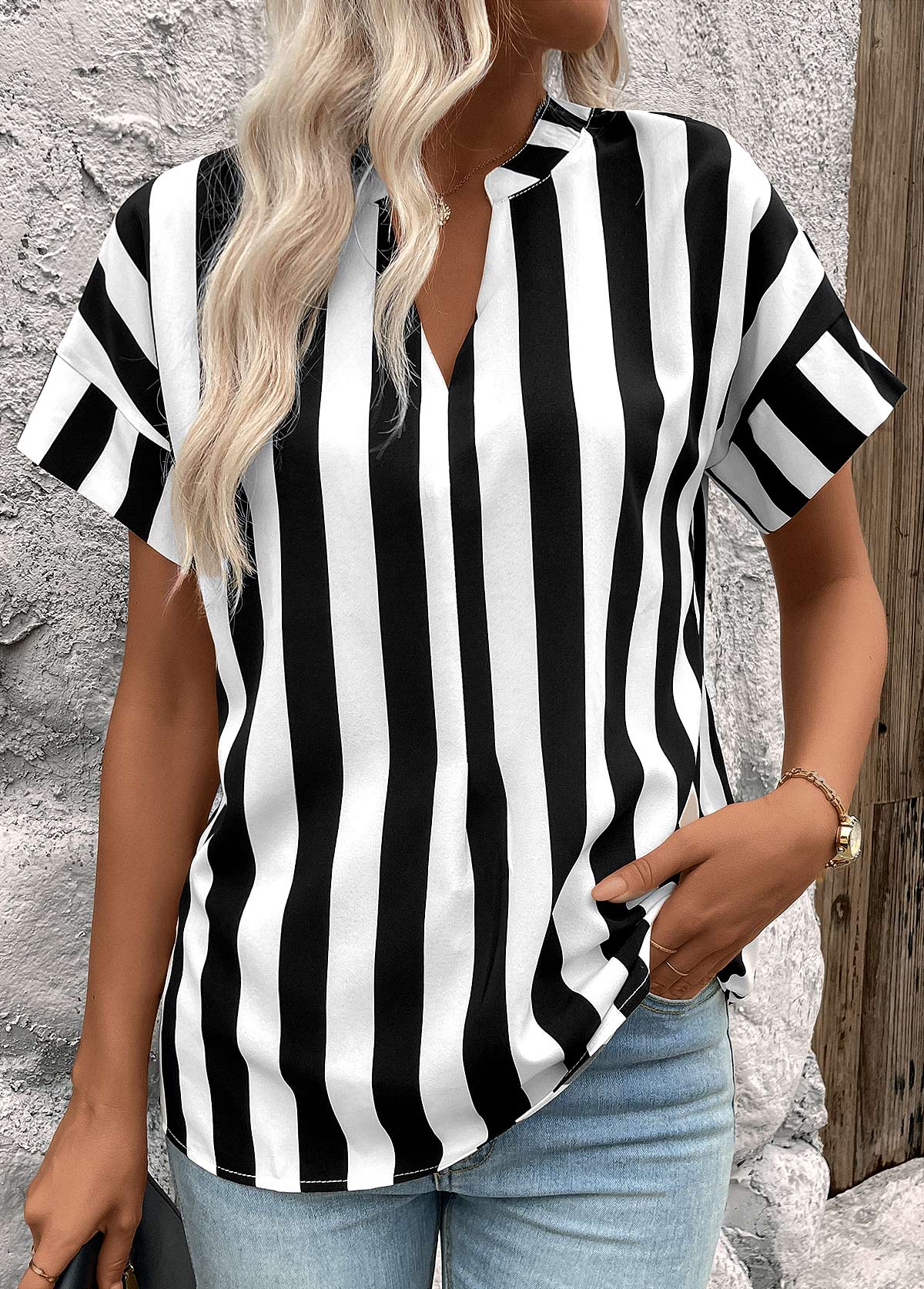 women's clothes / Tops / Blouses  /  Black Patchwork Striped Short Sleeve Split Neck Blouse