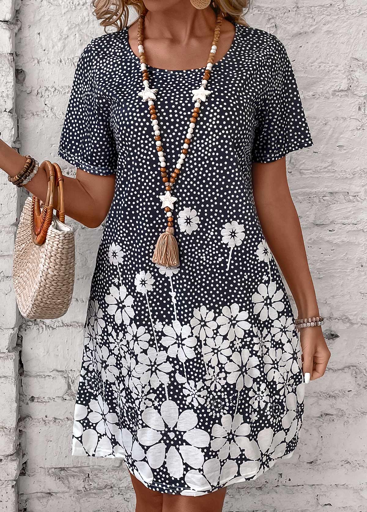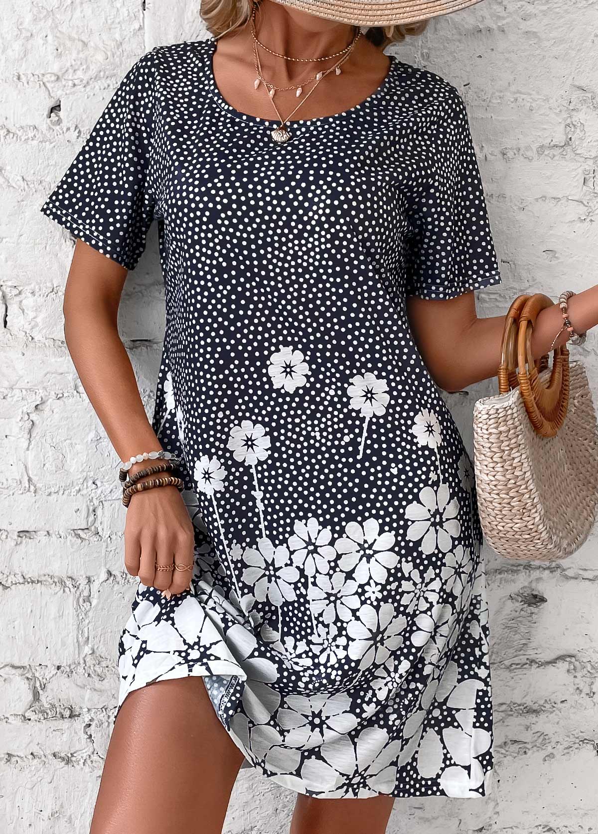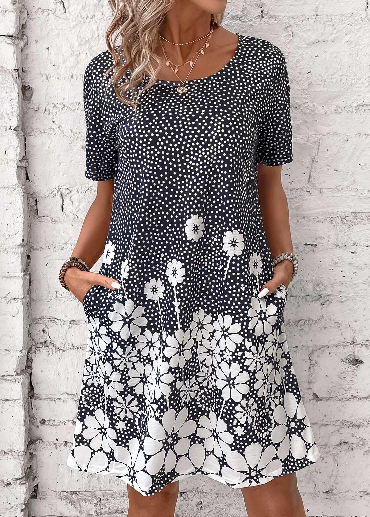 women's clothes / Dresses  /  Black Pocket Floral Print Short Round Neck Dress
