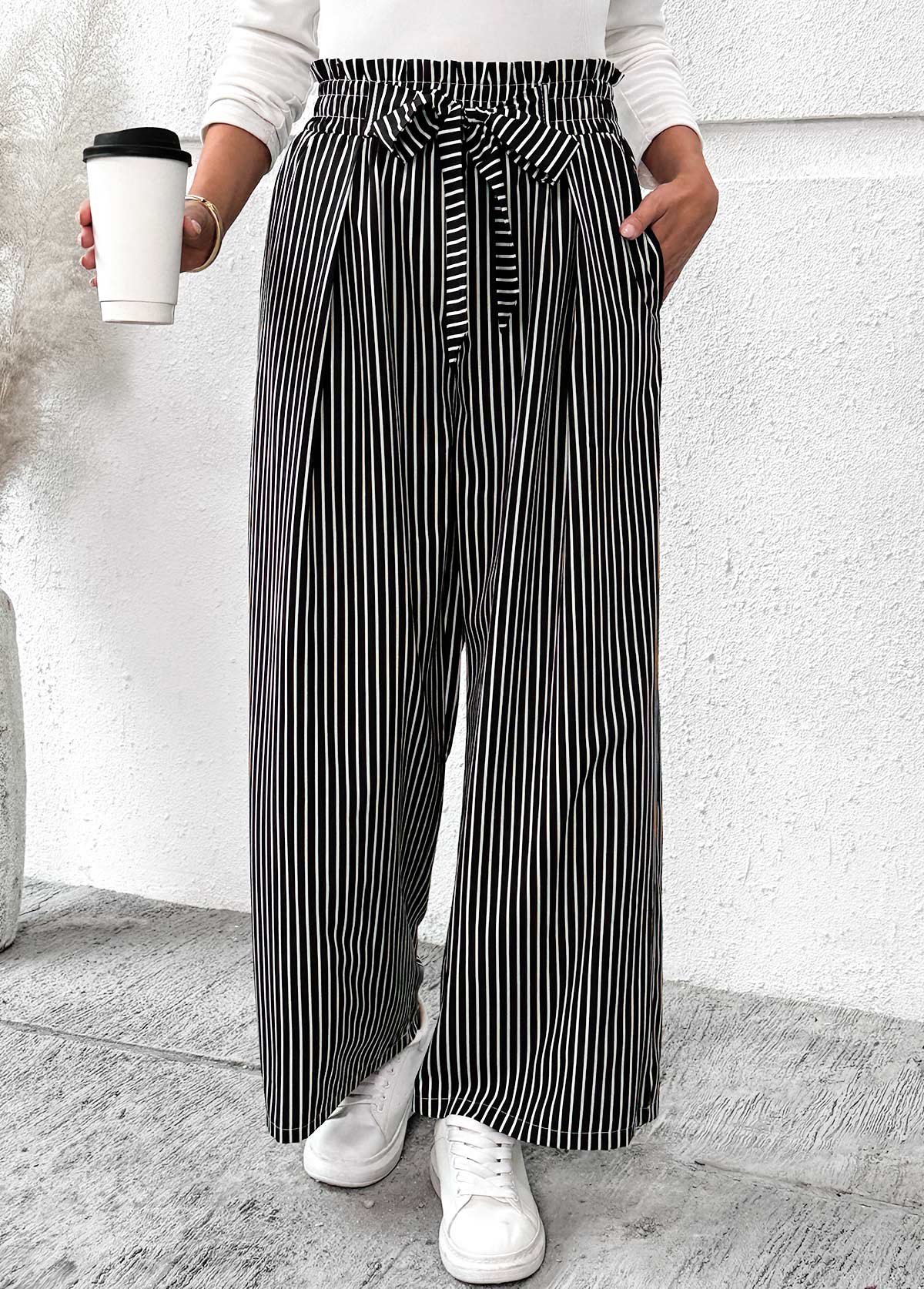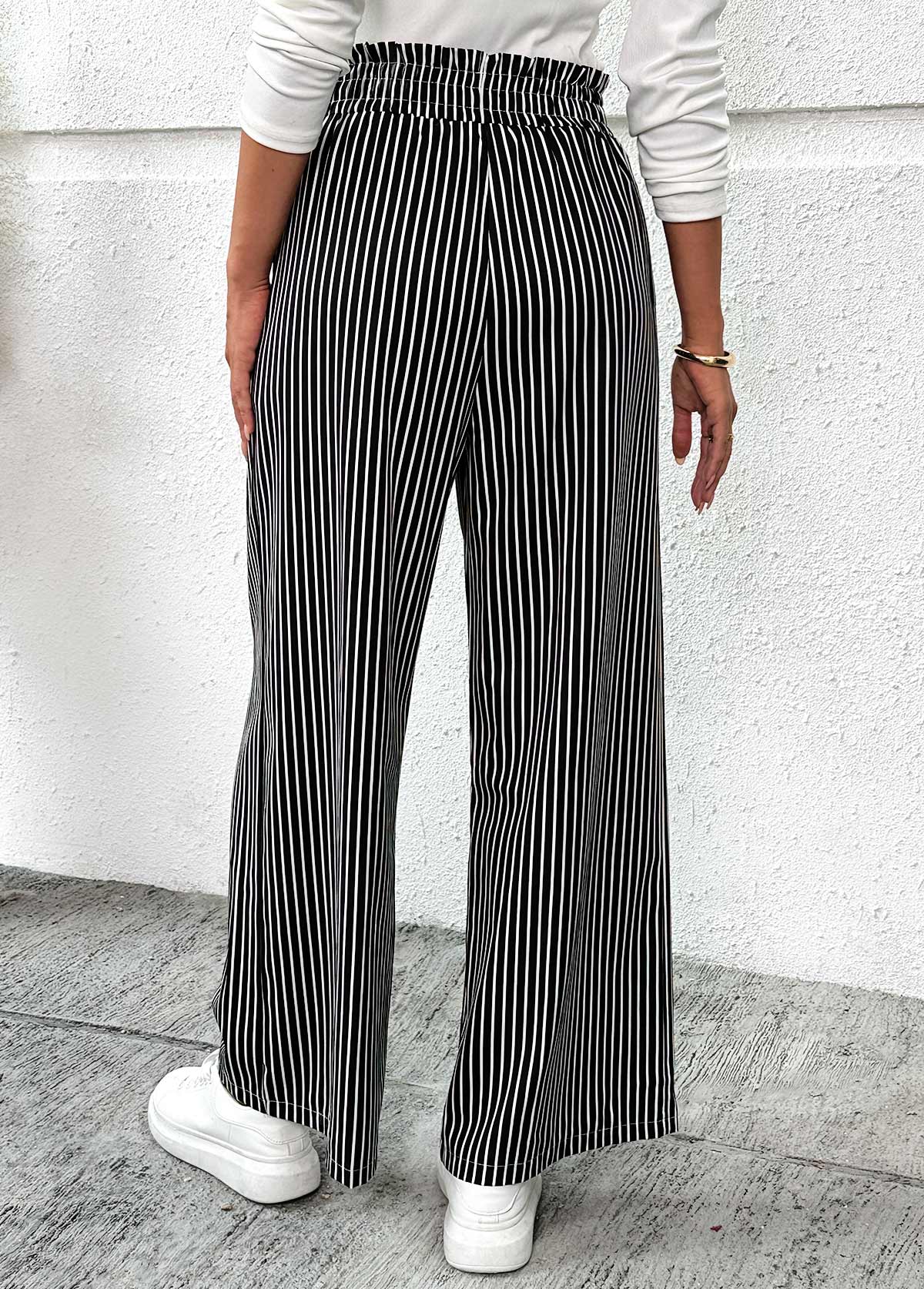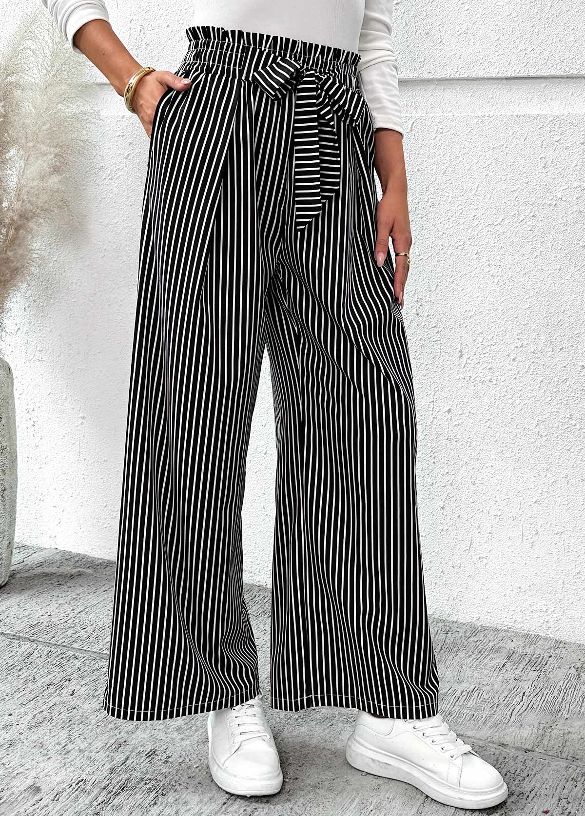 MODLILY DESIGN Black Pocket Striped Wide Leg Elastic Waist Pants
