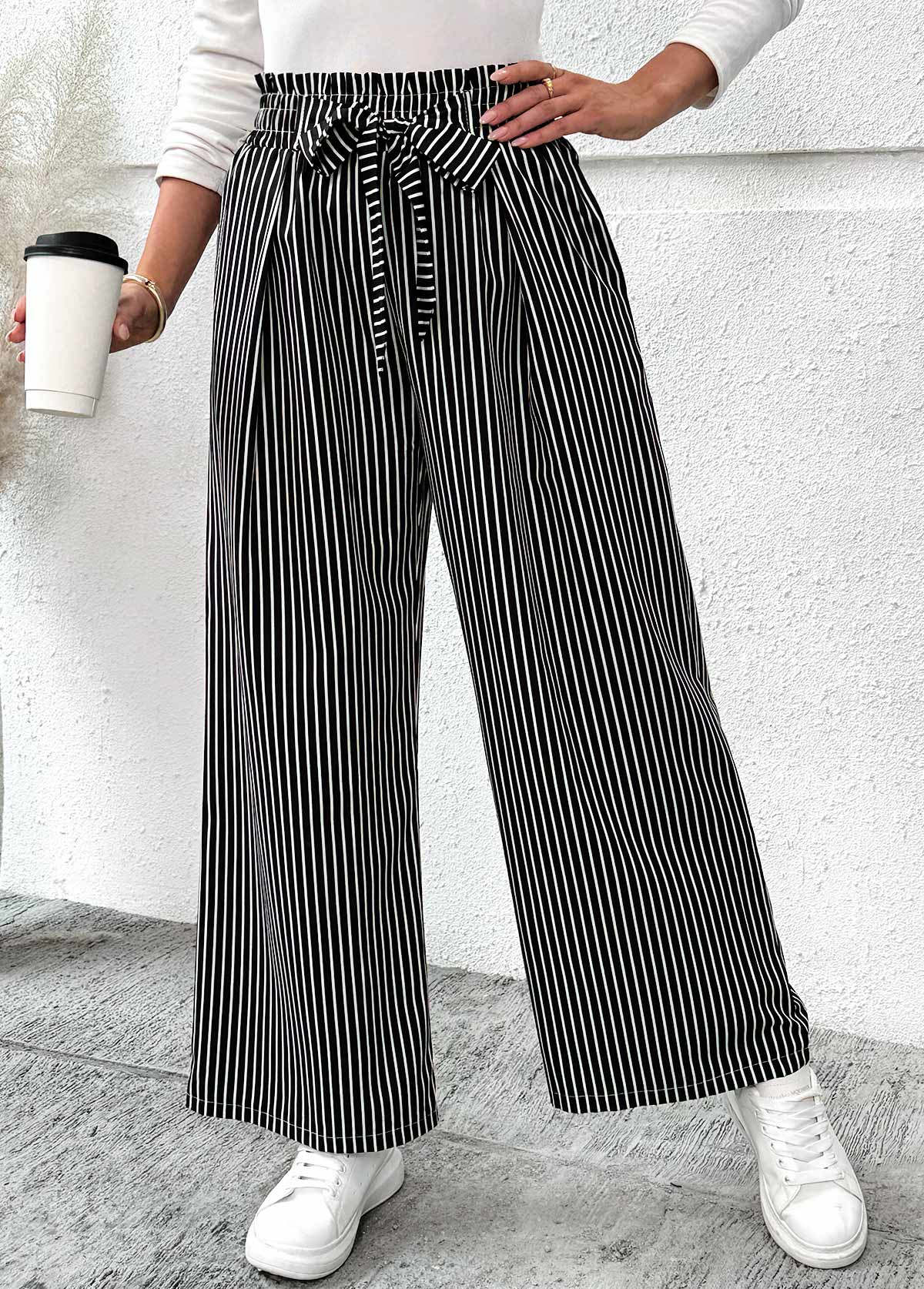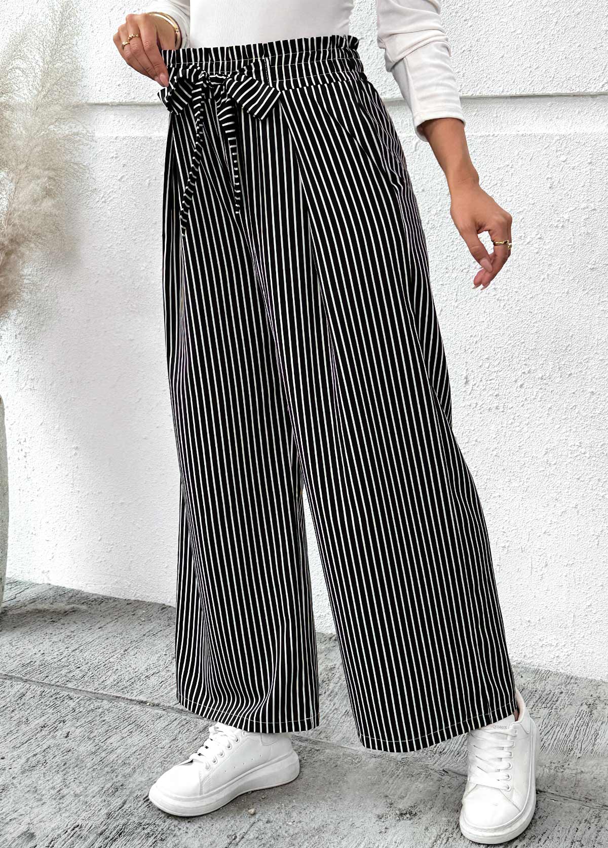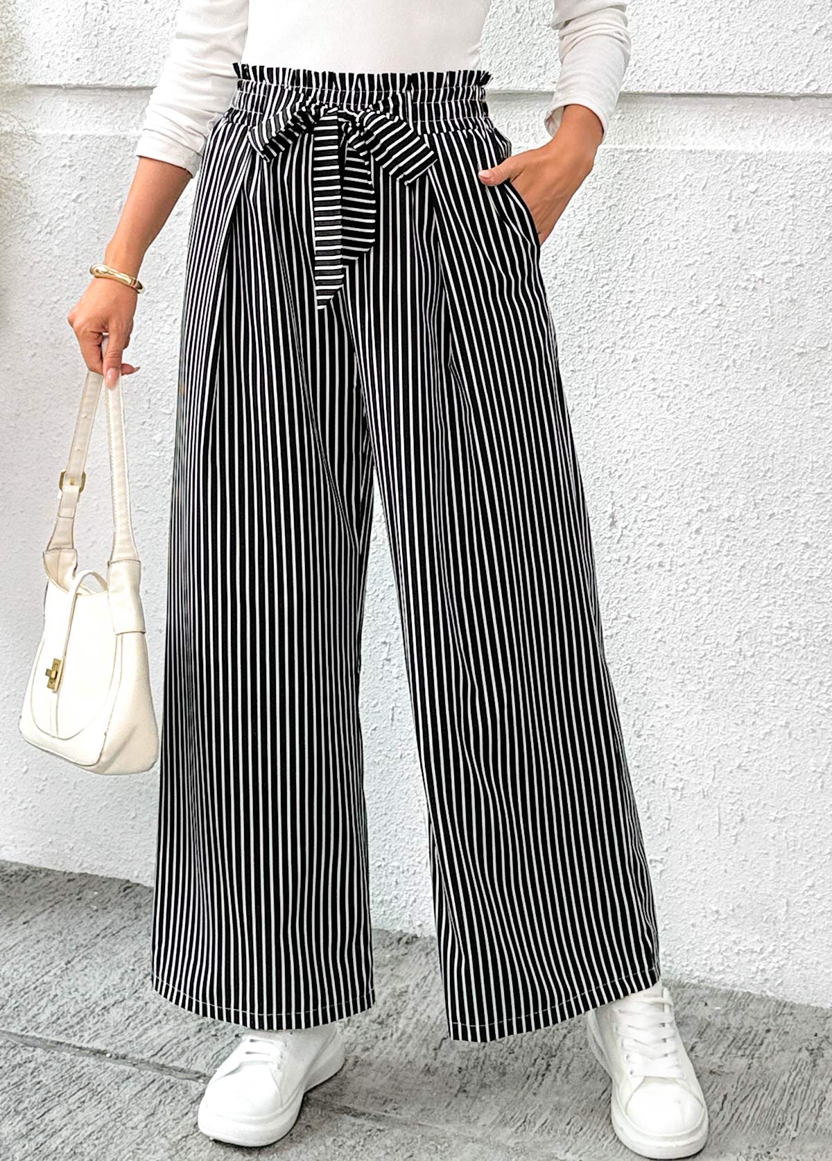 MODLILY DESIGN Black Pocket Striped Wide Leg Elastic Waist Pants