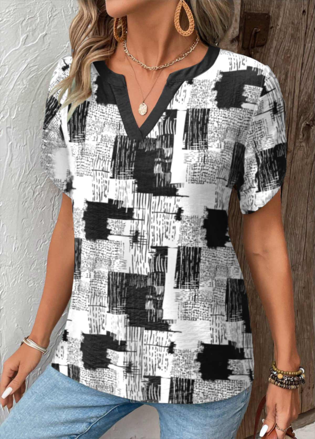 Raw White Geometric Print Twist Short Sleeve T Shirt