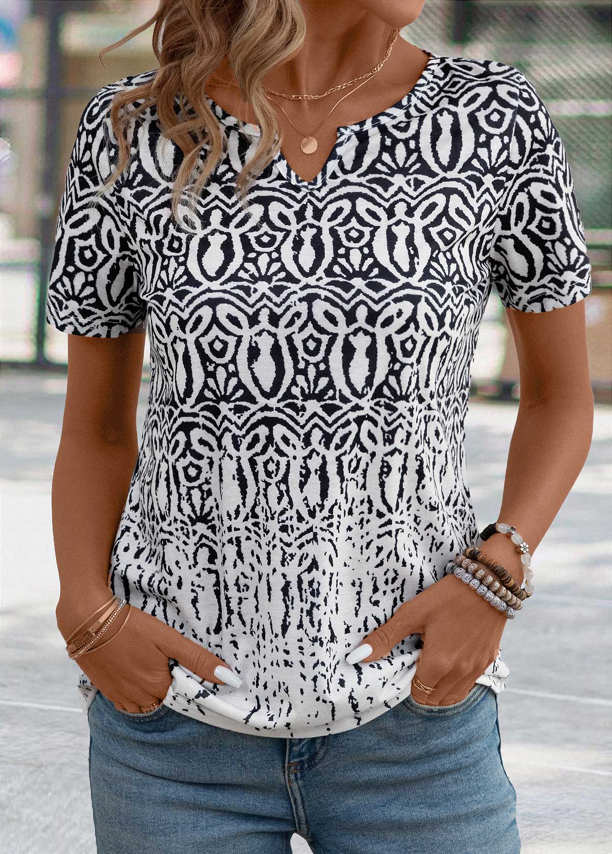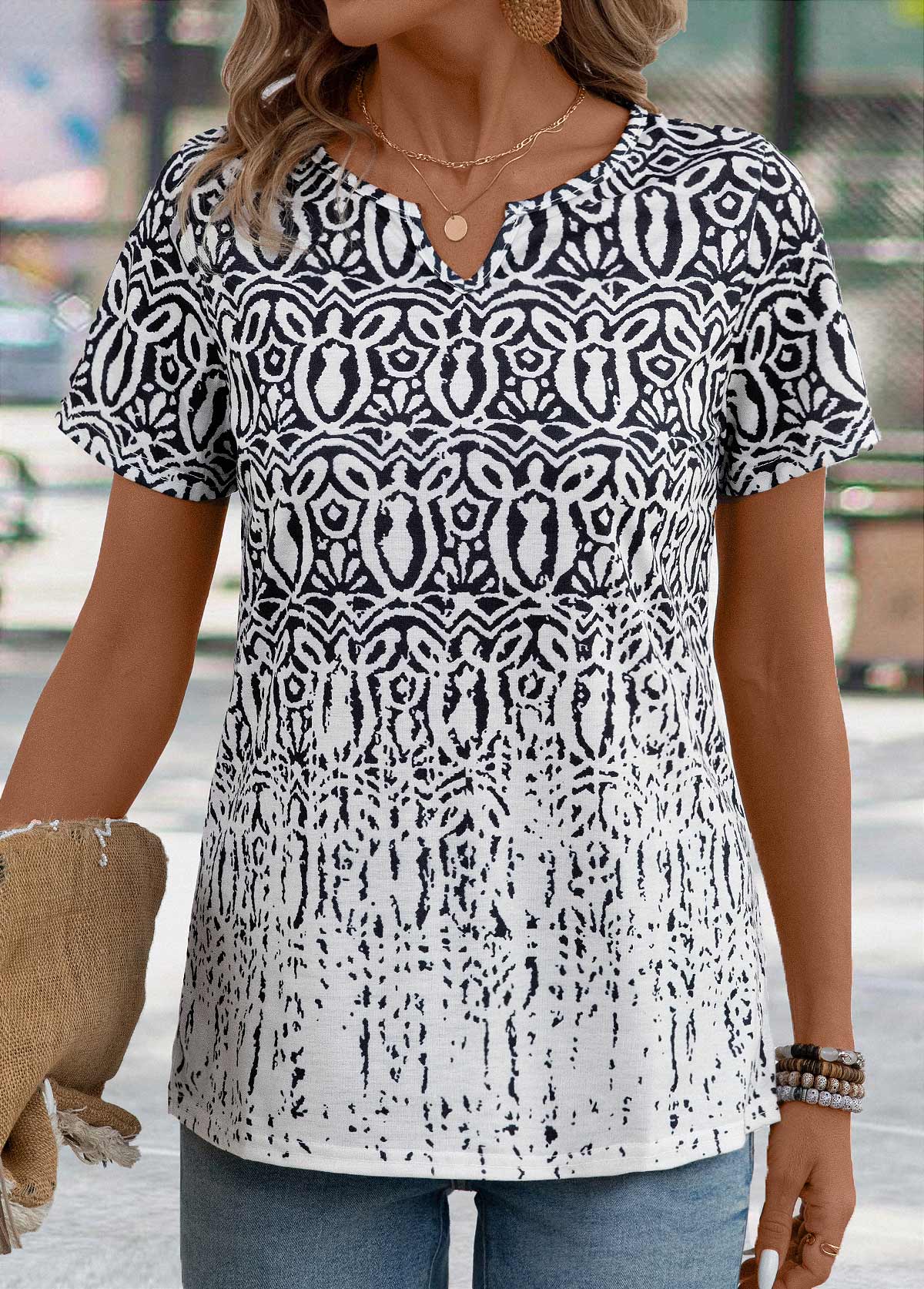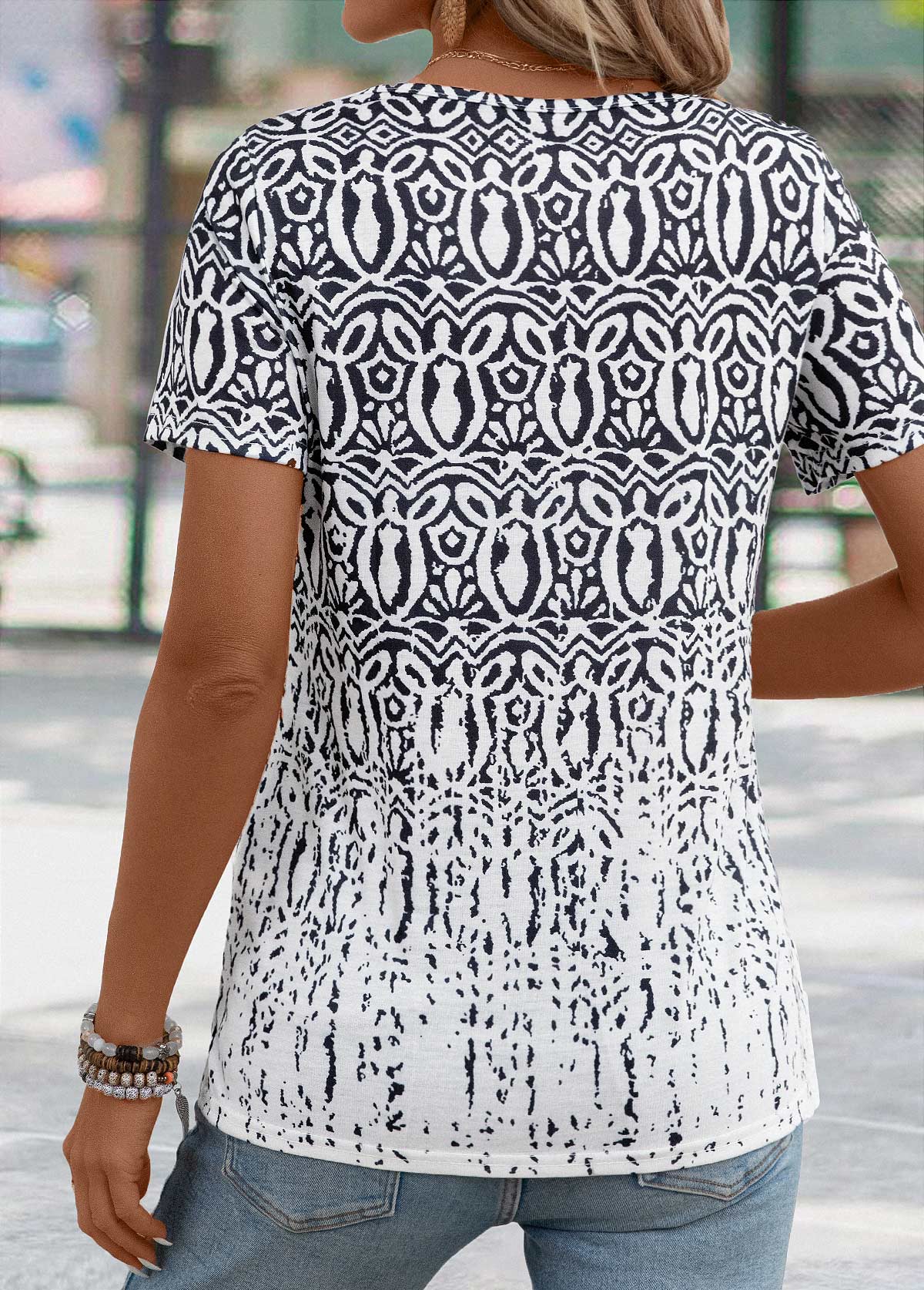 Black Tribal Print Short Sleeve Split Neck T Shirt