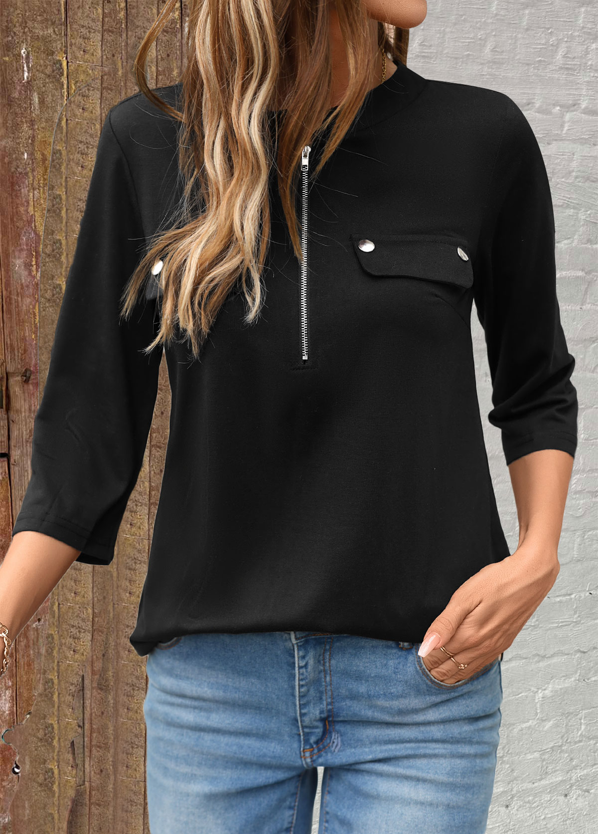 Blue Striped 3/4 Sleeve Split Neck Shirt