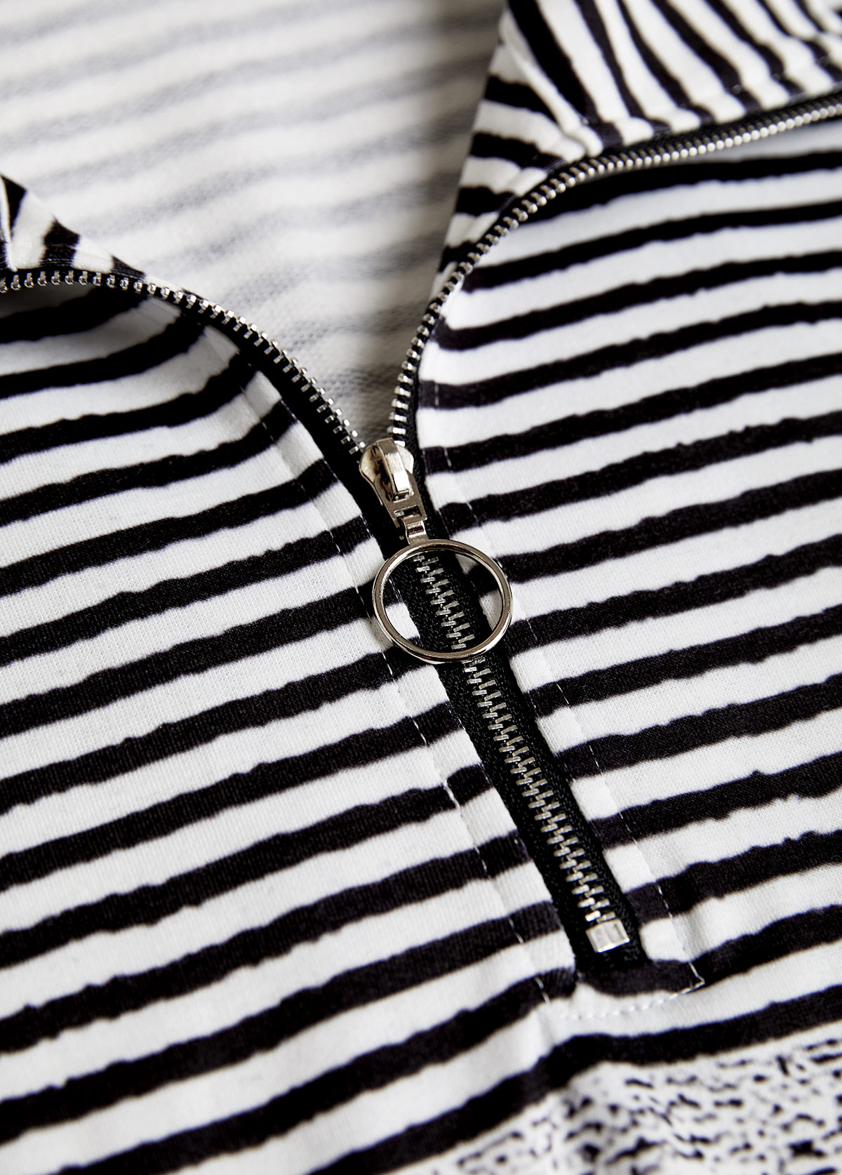 Elevate your casual look with this black, white, and gray color-blocked sweatshirt. The stylish turn-down collar with a zip closure adds a modern touch, while the mid-length tunic design ensures ample tummy coverage. Perfect for laid-back days, it effortlessly combines comfort with contemporary flair.