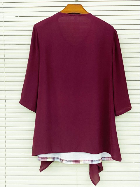 Wine Red Tummy Coverage Long Sleeve Split Neck Blouse