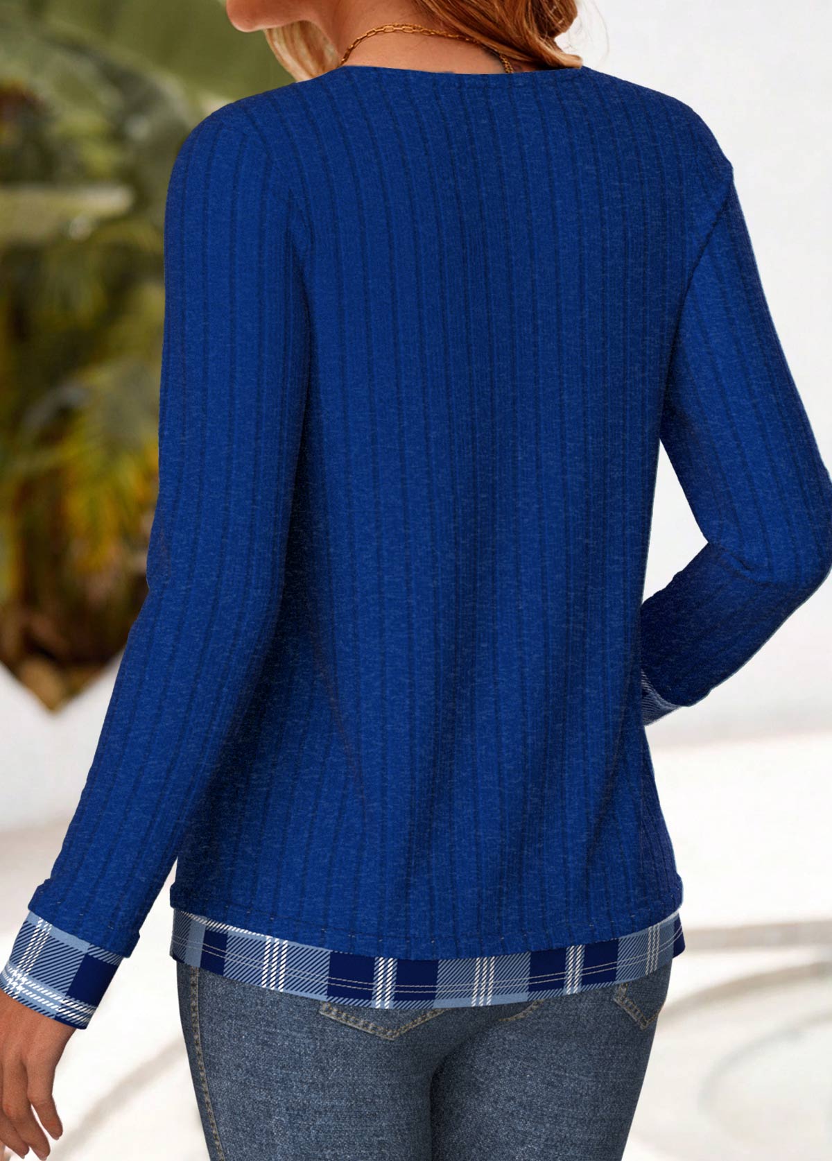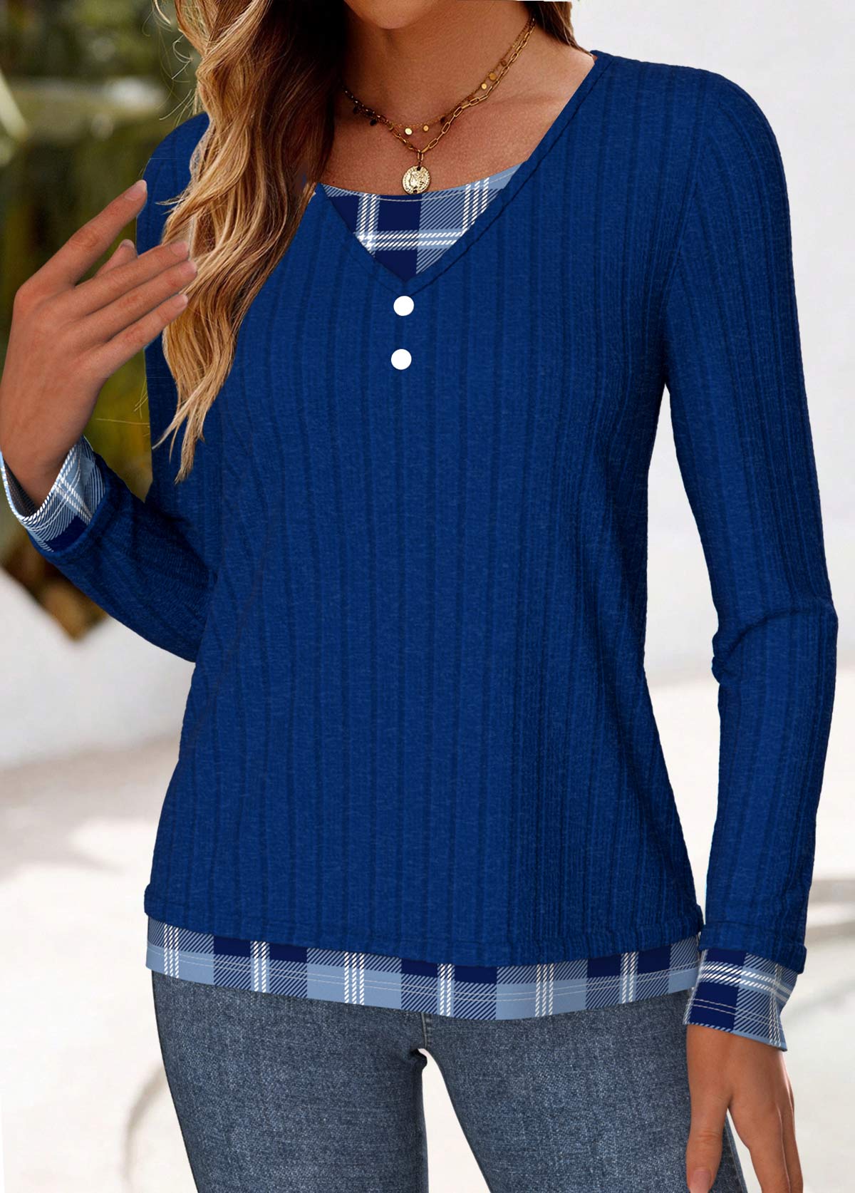 Blue Button Plaid Long Sleeve Fake Two Piece Twinset