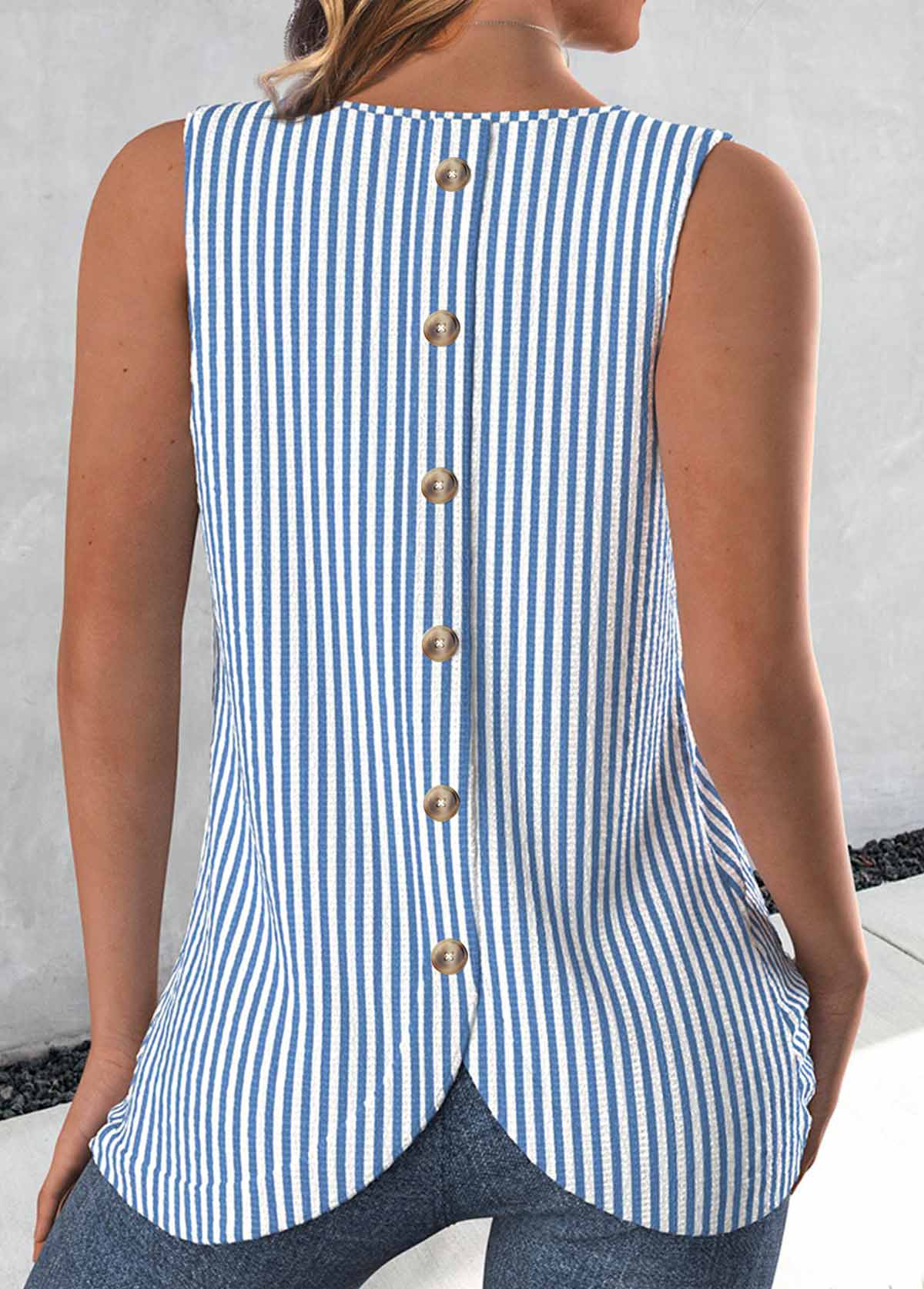 Blue Button Striped Sleeveless Round Neck Tank Top