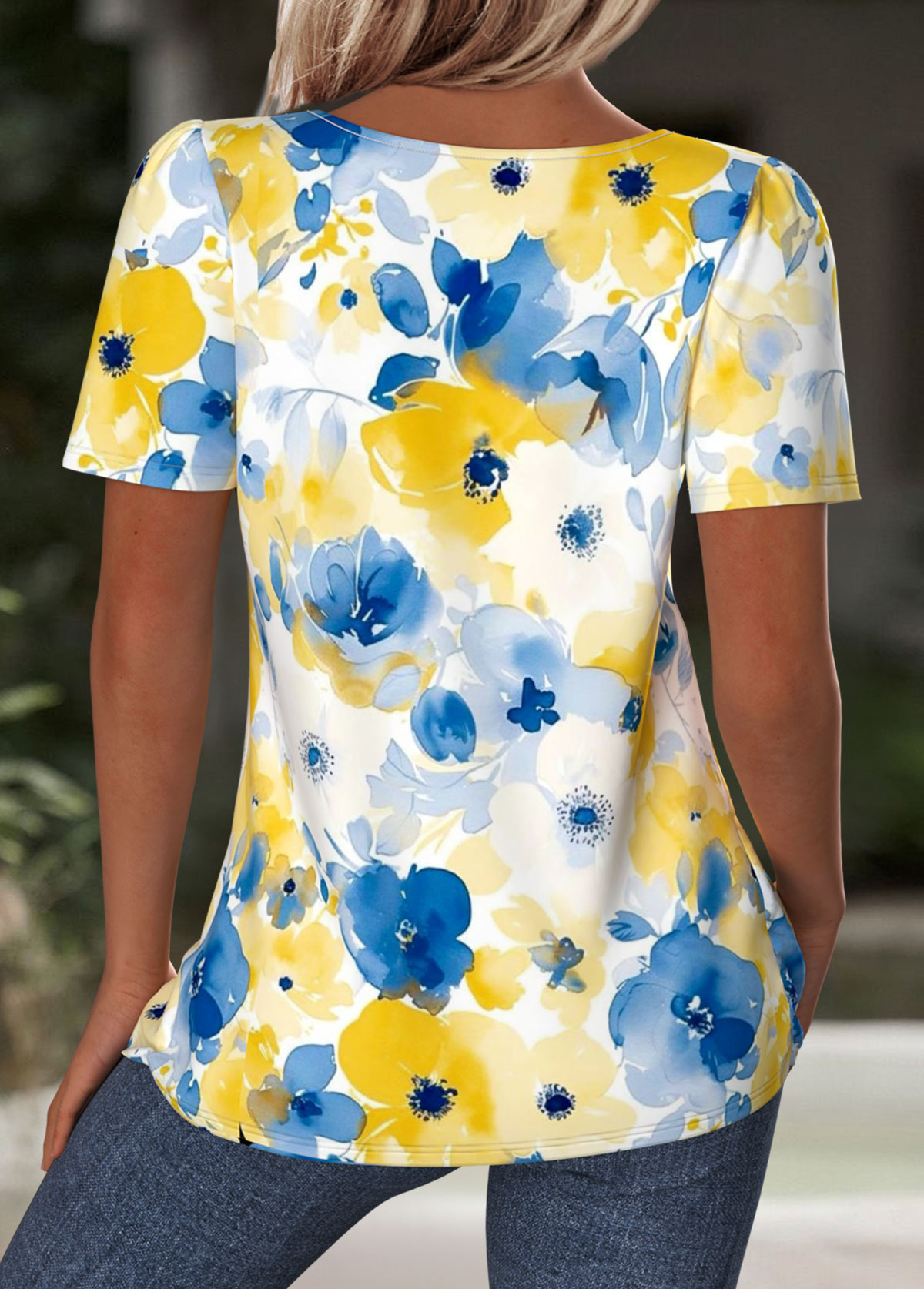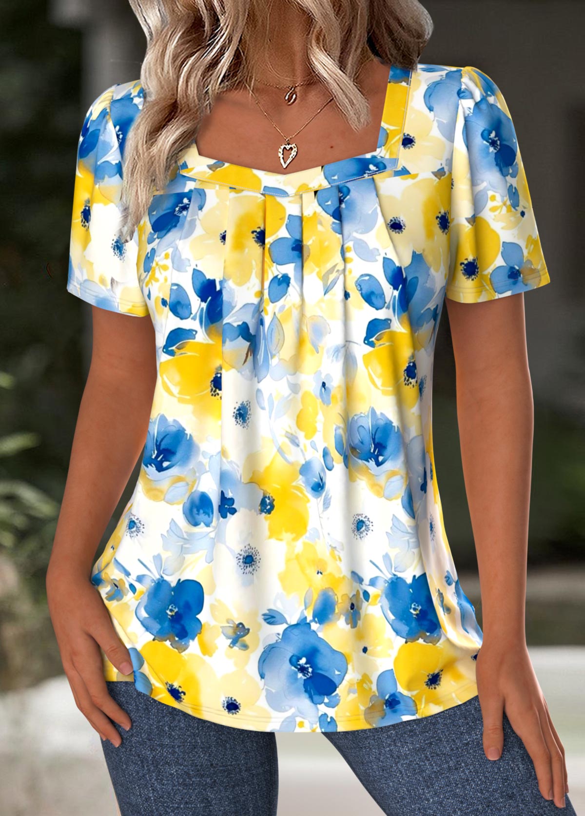 Blue Floral Print Short Sleeve Square Neck T Shirt