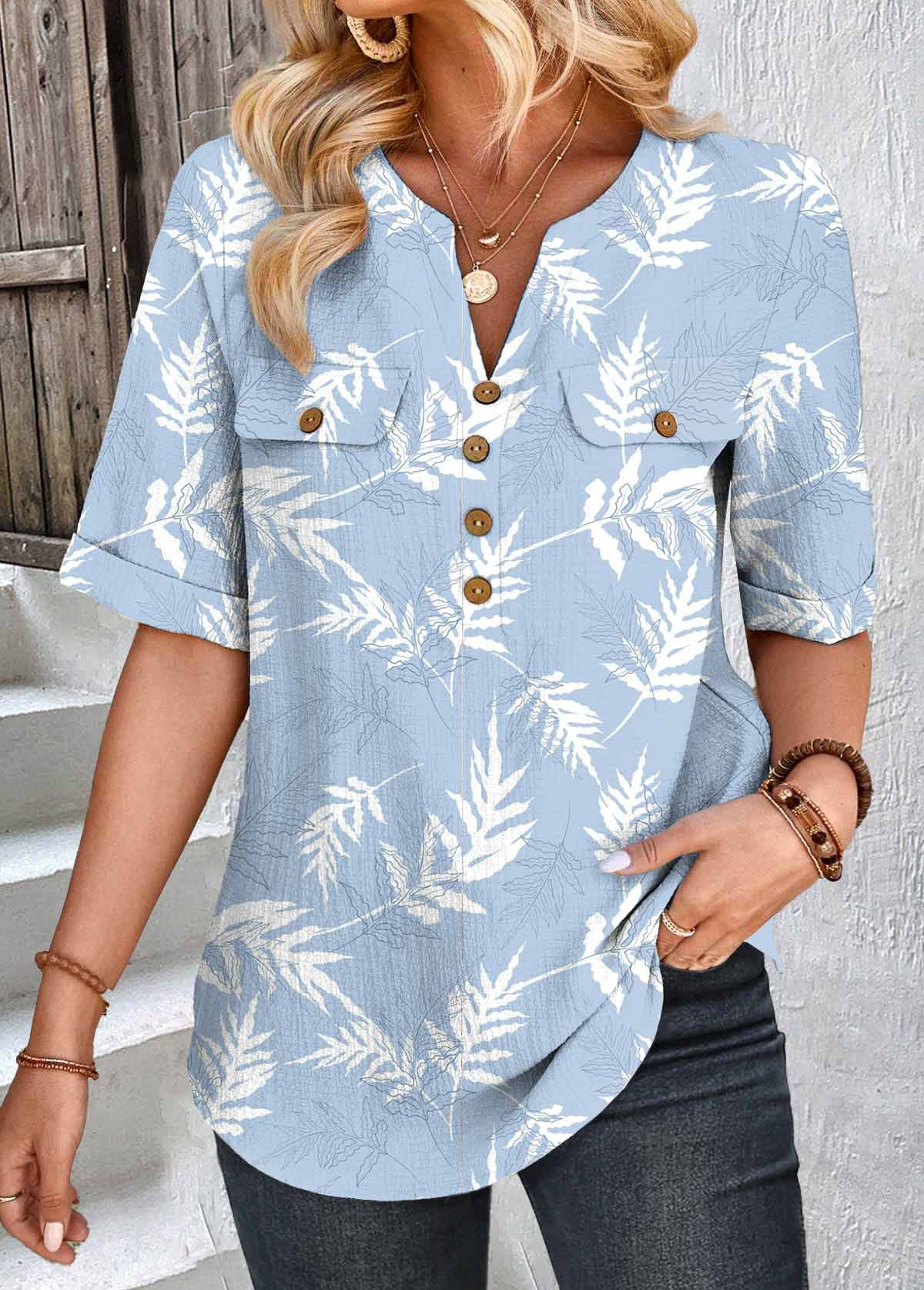 Blue Striped Short Sleeve Split Neck T Shirt