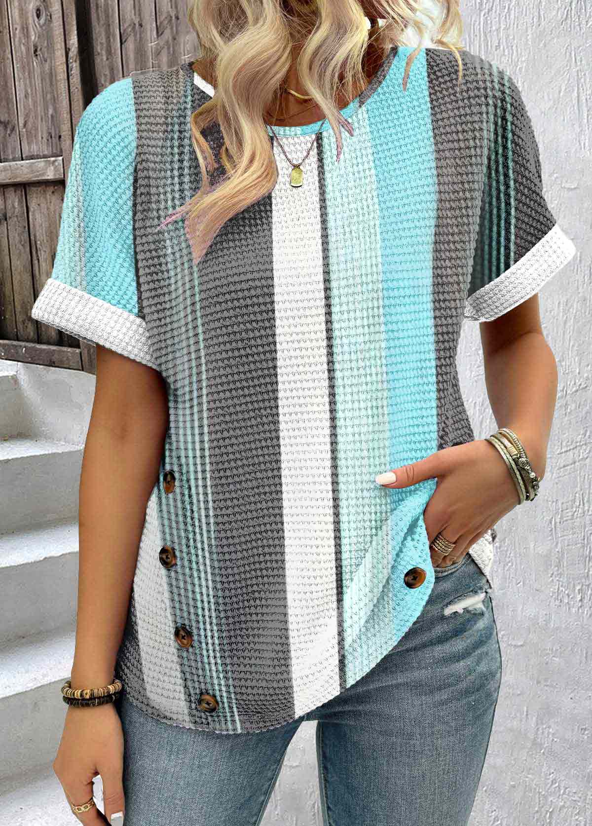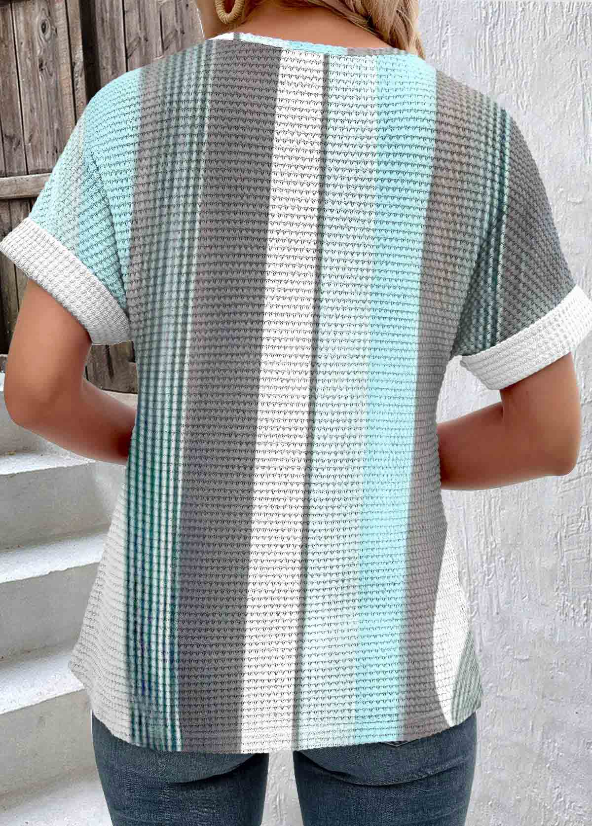 women's clothes / Tops / Tees&T-shirts  /  Blue Patchwork Striped Short Sleeve Round Neck T Shirt