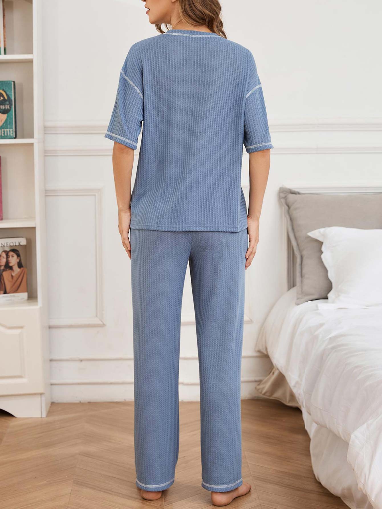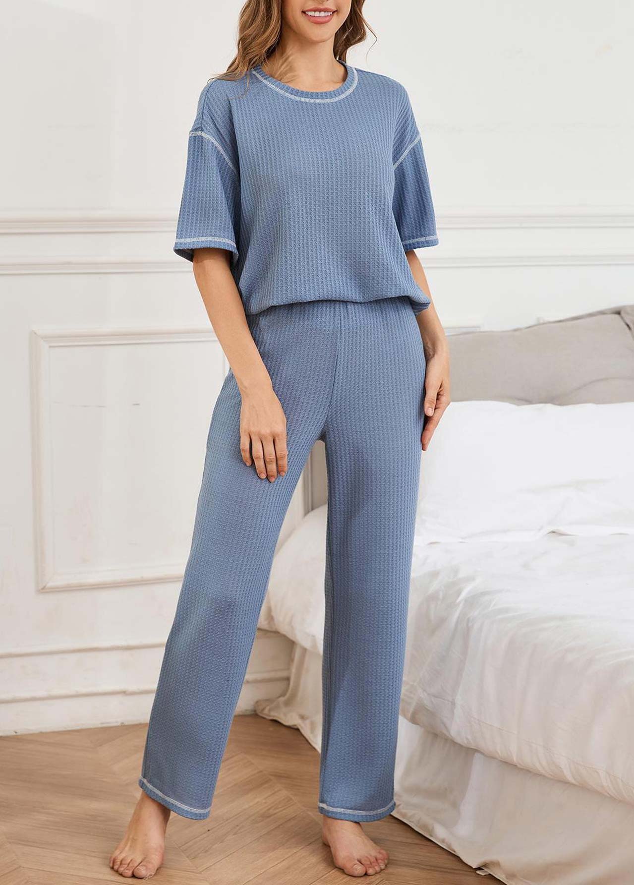 women's clothes / Loungewear / Loungewear Sets  /  Blue Short Sleeve Round Neck Lounge Top and Pants