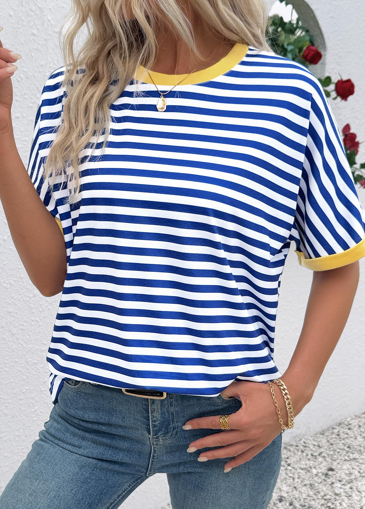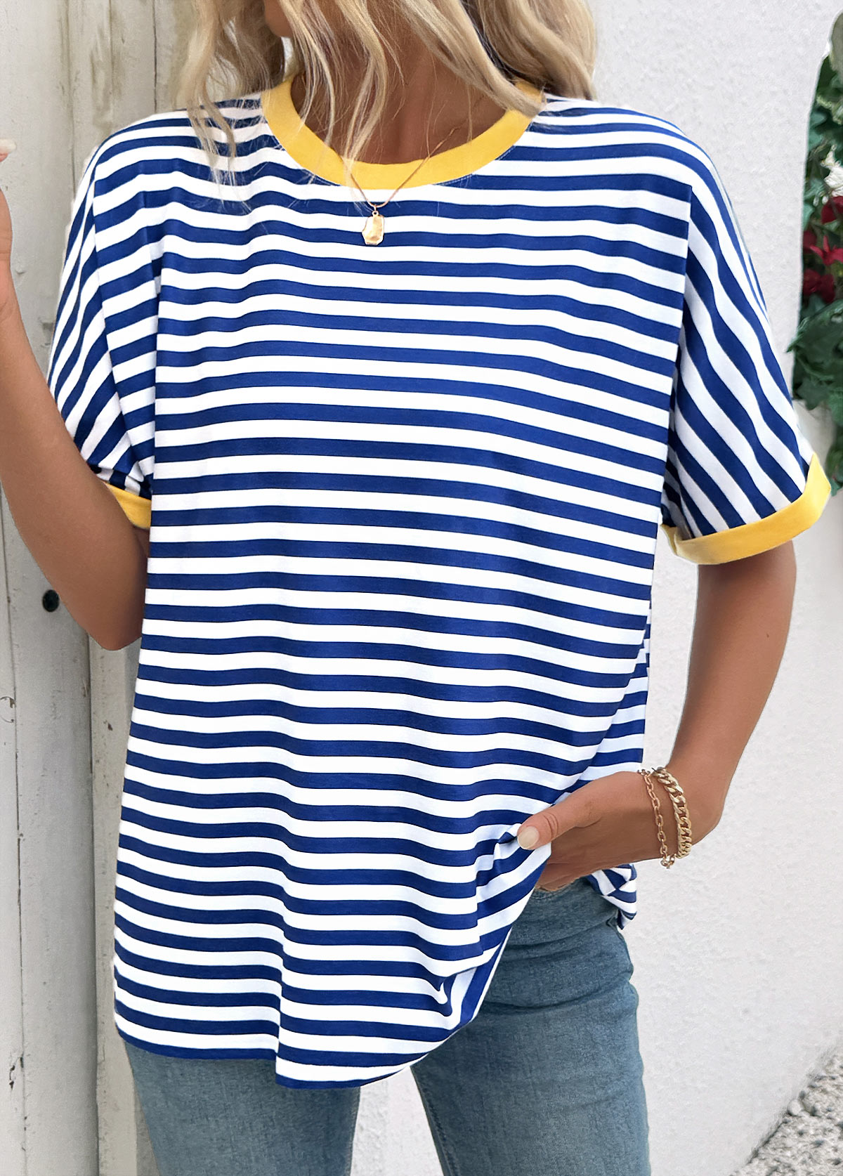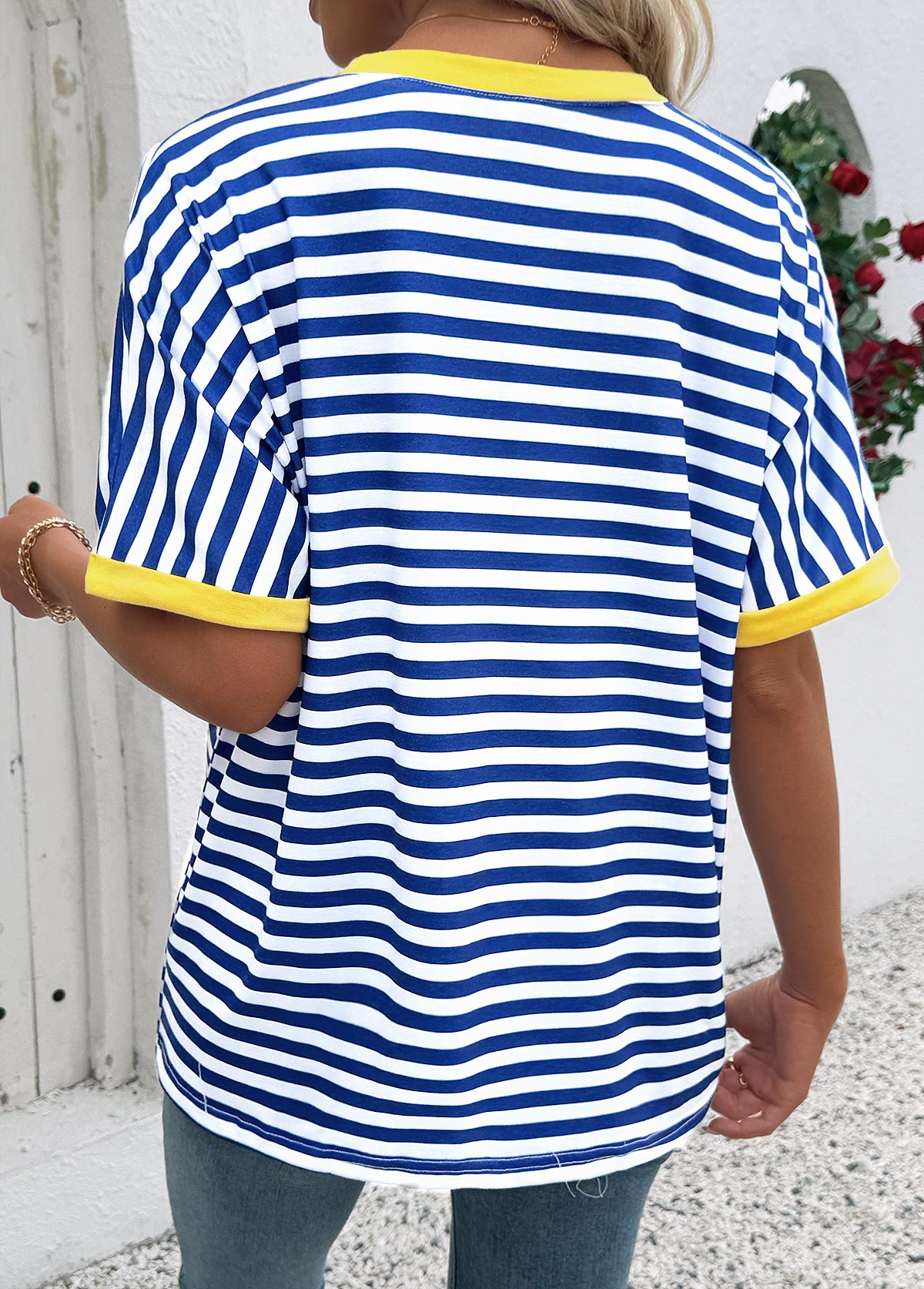 Blue Striped Short Sleeve Split Neck T Shirt