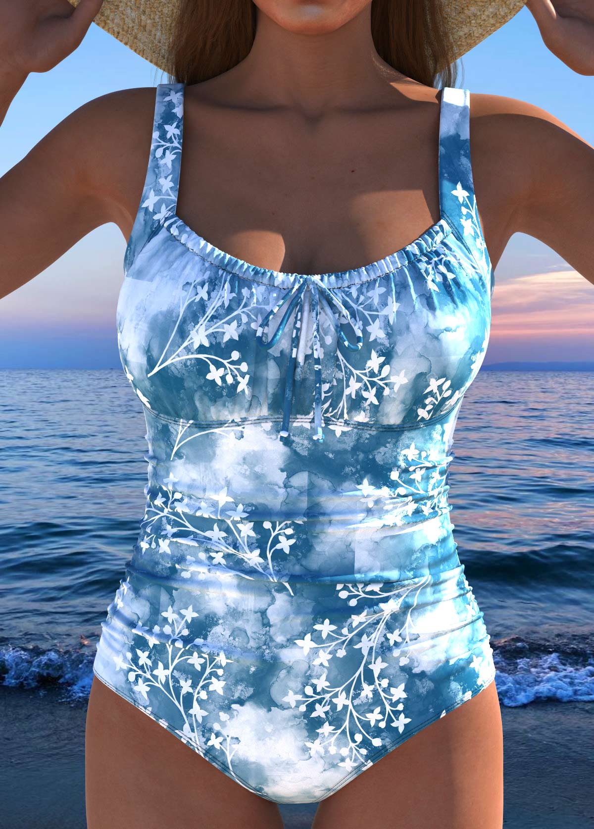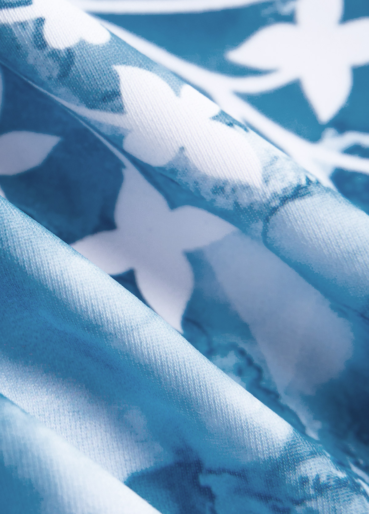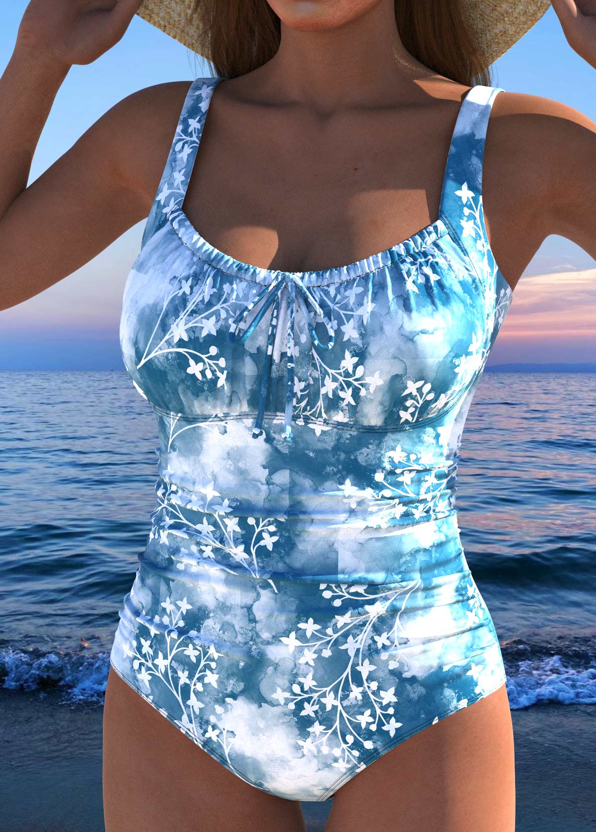 Curved Hem Random Floral Print Blue One Piece Swimdress
