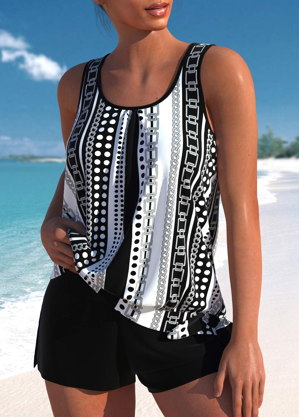 Tummy Coverage Mid Waisted Tribal Print Black Tankini Set