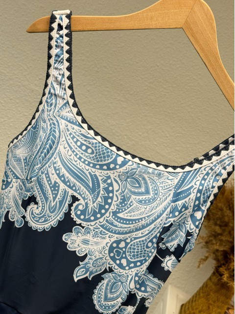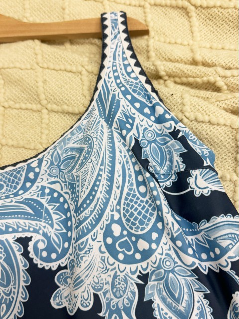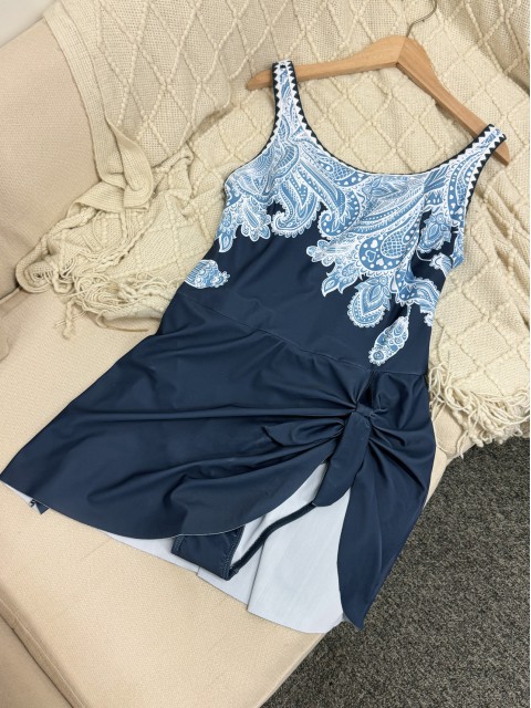 Turn heads by the shore in this elegant paisley print one-piece swimdress. With contrast binding, a playful bowknot detail, and an asymmetrical hemline, it offers a stylish twist on classic beachwear. Perfect for lounging or taking a dip, it combines fashion and function for your beach day.