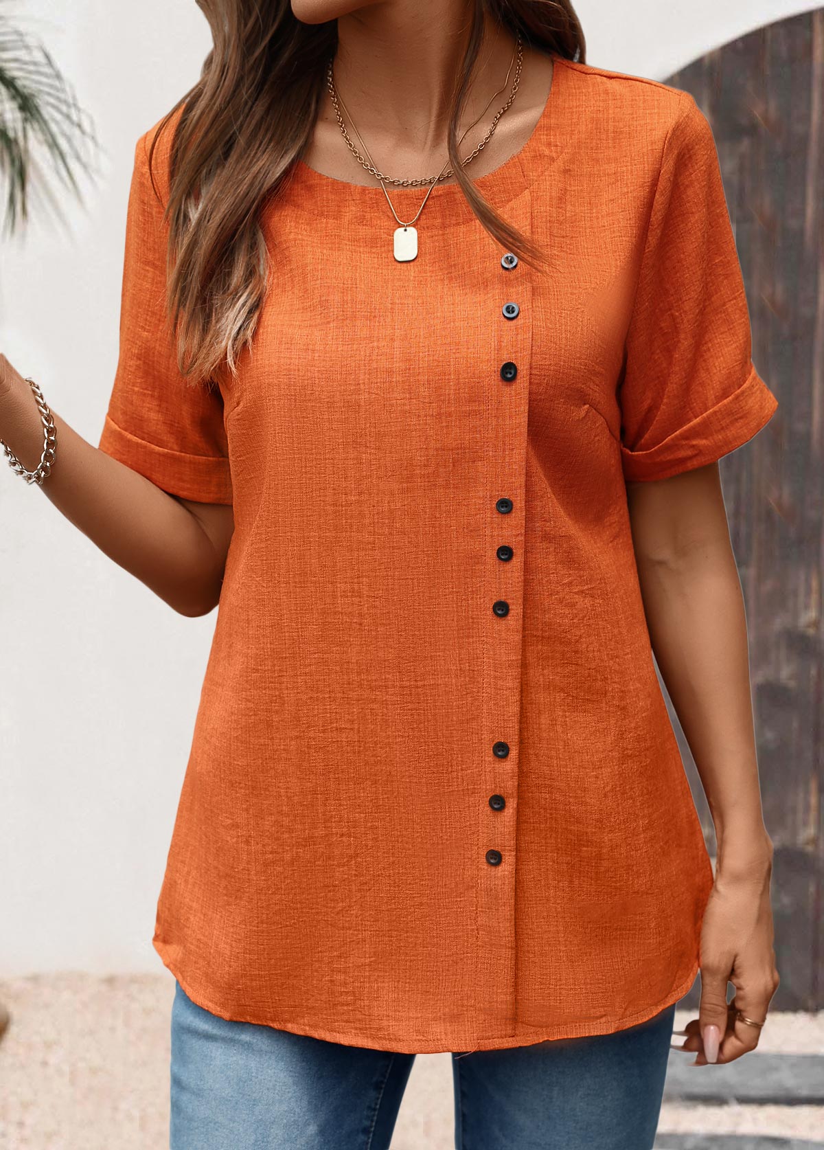 • Brick Red Button Short Sleeve Round Neck Blouse | thumb picture