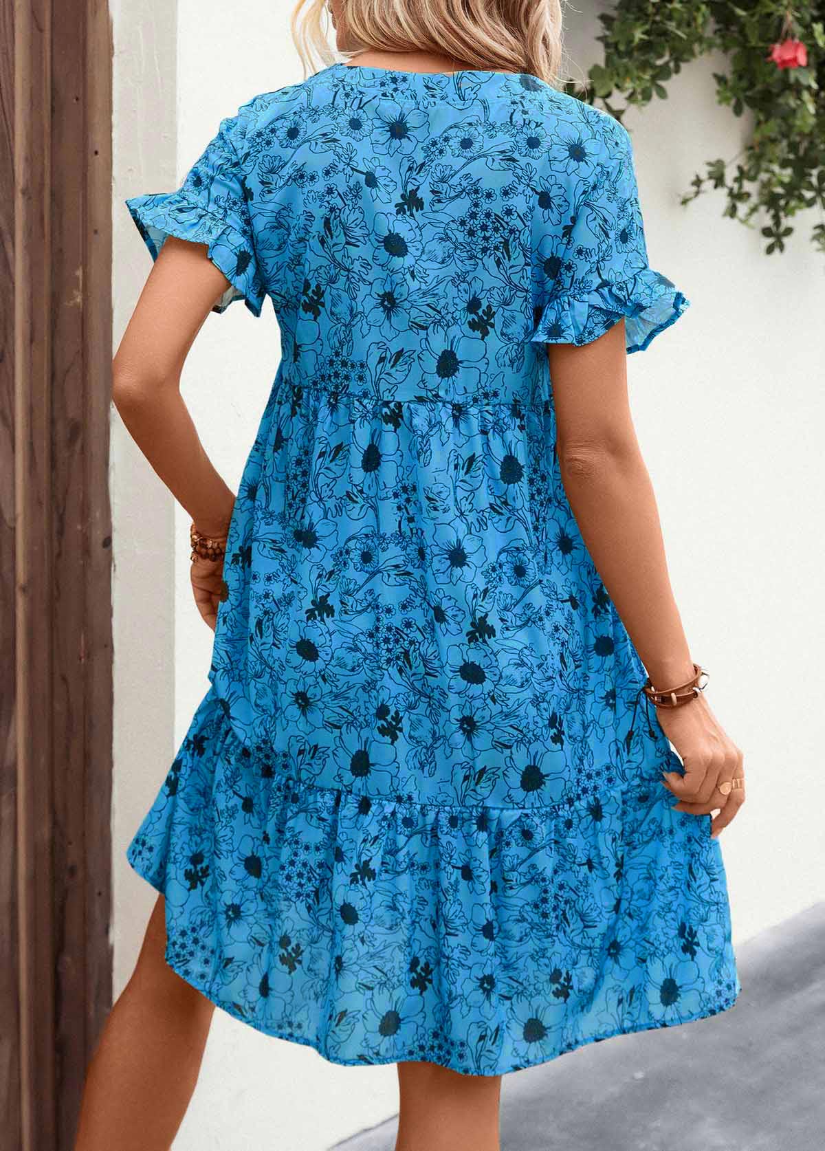 Blue Smocked Ditsy Floral Print Half Sleeve Dress