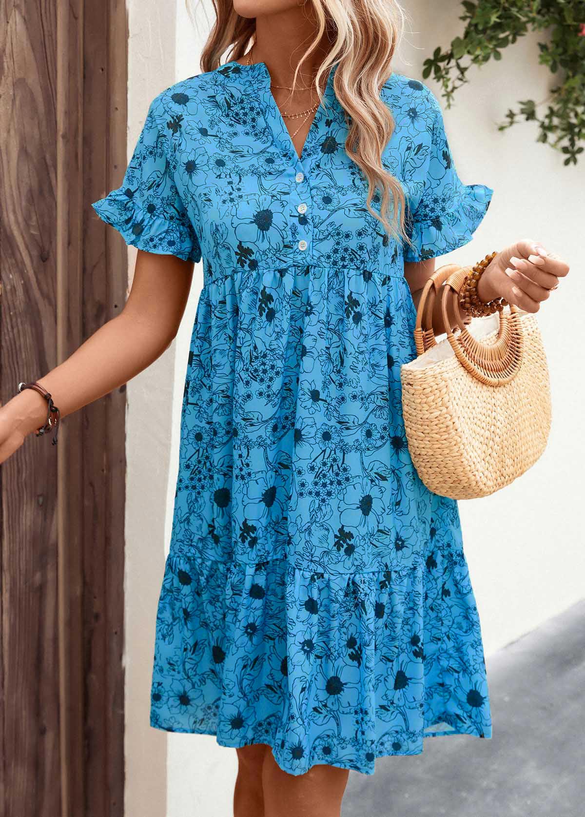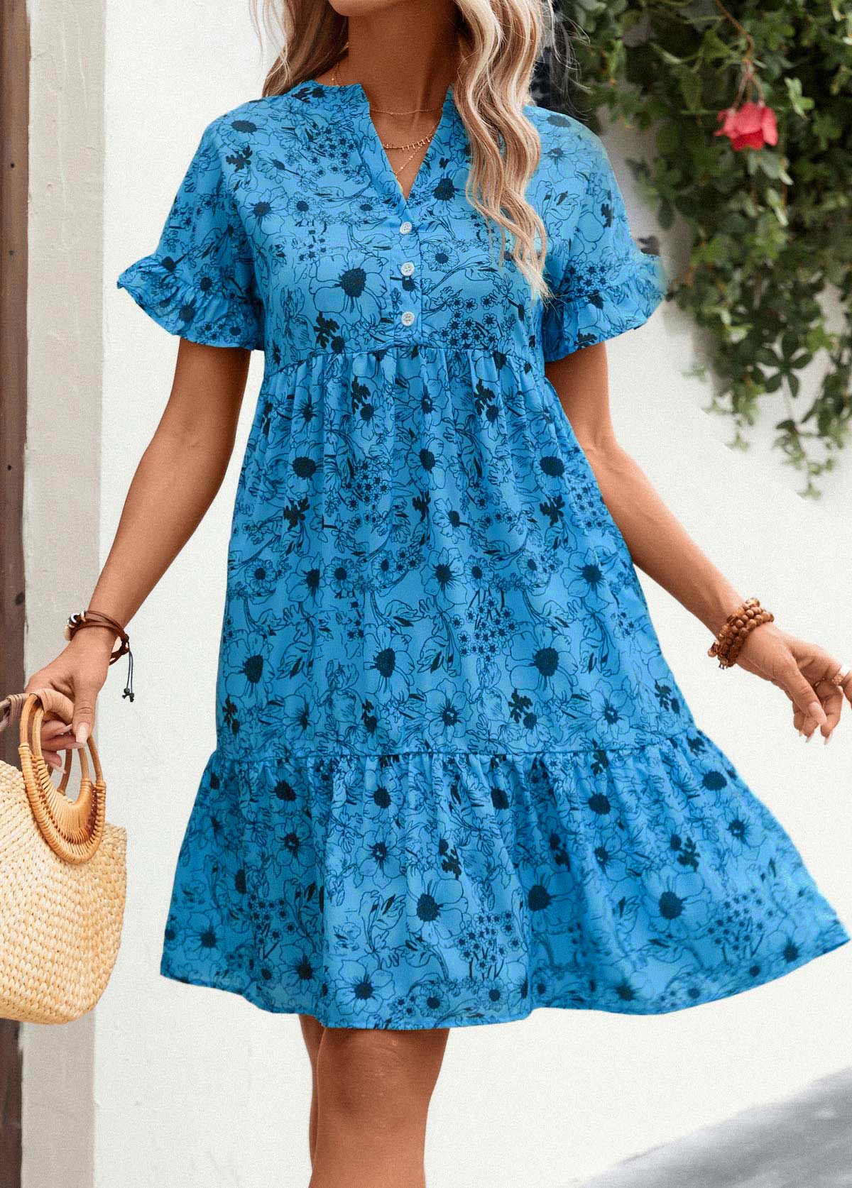 Multi Color Floral Print Half Sleeve Split Neck Dress