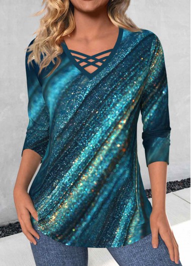 Peacock Blue Criss Cross Ombre Long Sleeve T Shirt