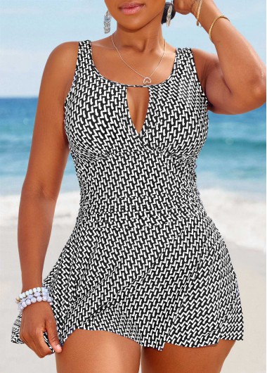 Added Successfully Cut Out Geometric Print Black One Piece Swimdress