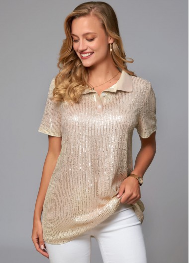 Added Successfully Turndown Collar Sequin Button Detail T Shirt