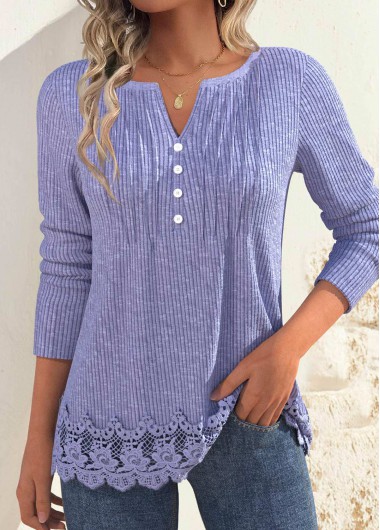 Added Successfully Peacock Blue Lace Long Sleeve V Neck T Shirt