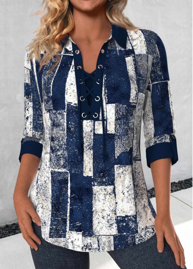 Added Successfully Navy Lace Up Geometric Print 3/4 Sleeve Blouse