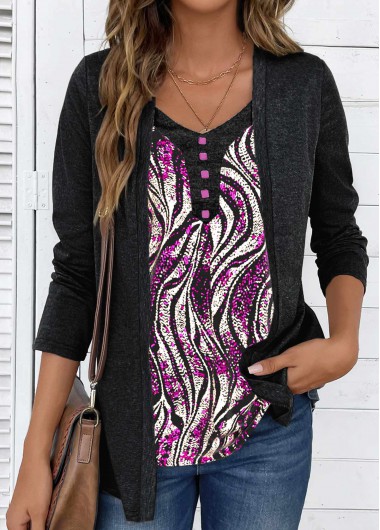 Added Successfully Black Patchwork Striped Long Sleeve Round Neck T Shirt