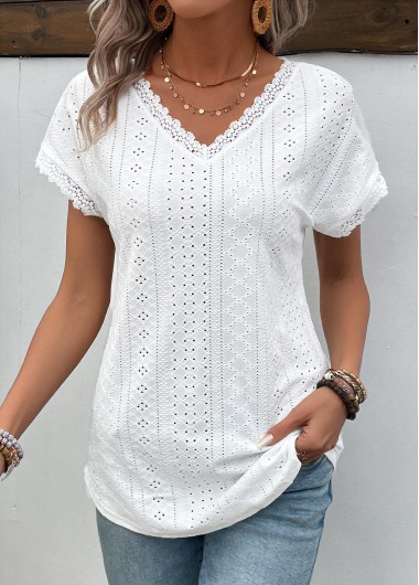 Added Successfully White Lace Floral Print Short Sleeve V Neck Blouse