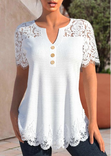 Added Successfully White Lace Short Sleeve Split Neck T Shirt