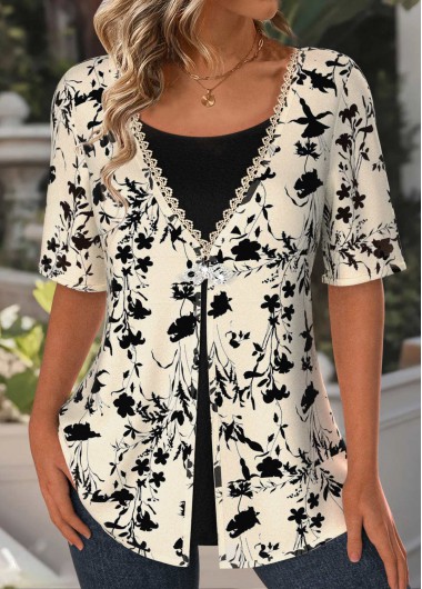Added Successfully Black Floral Print 3/4 Sleeve Fake Two Piece Twinset